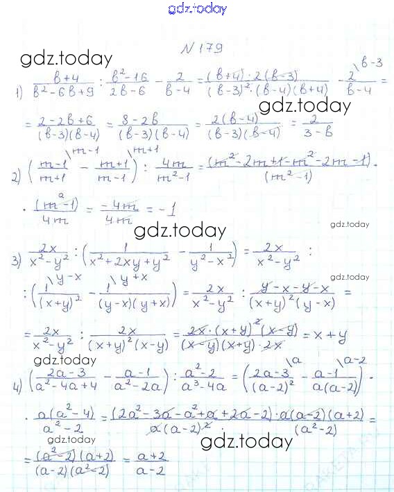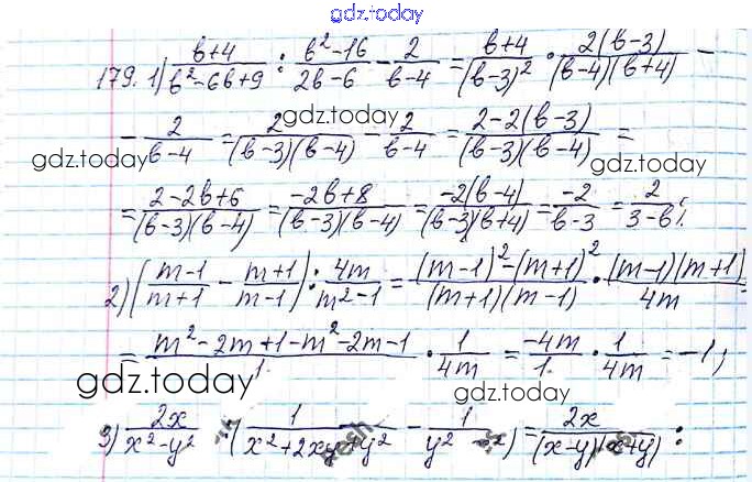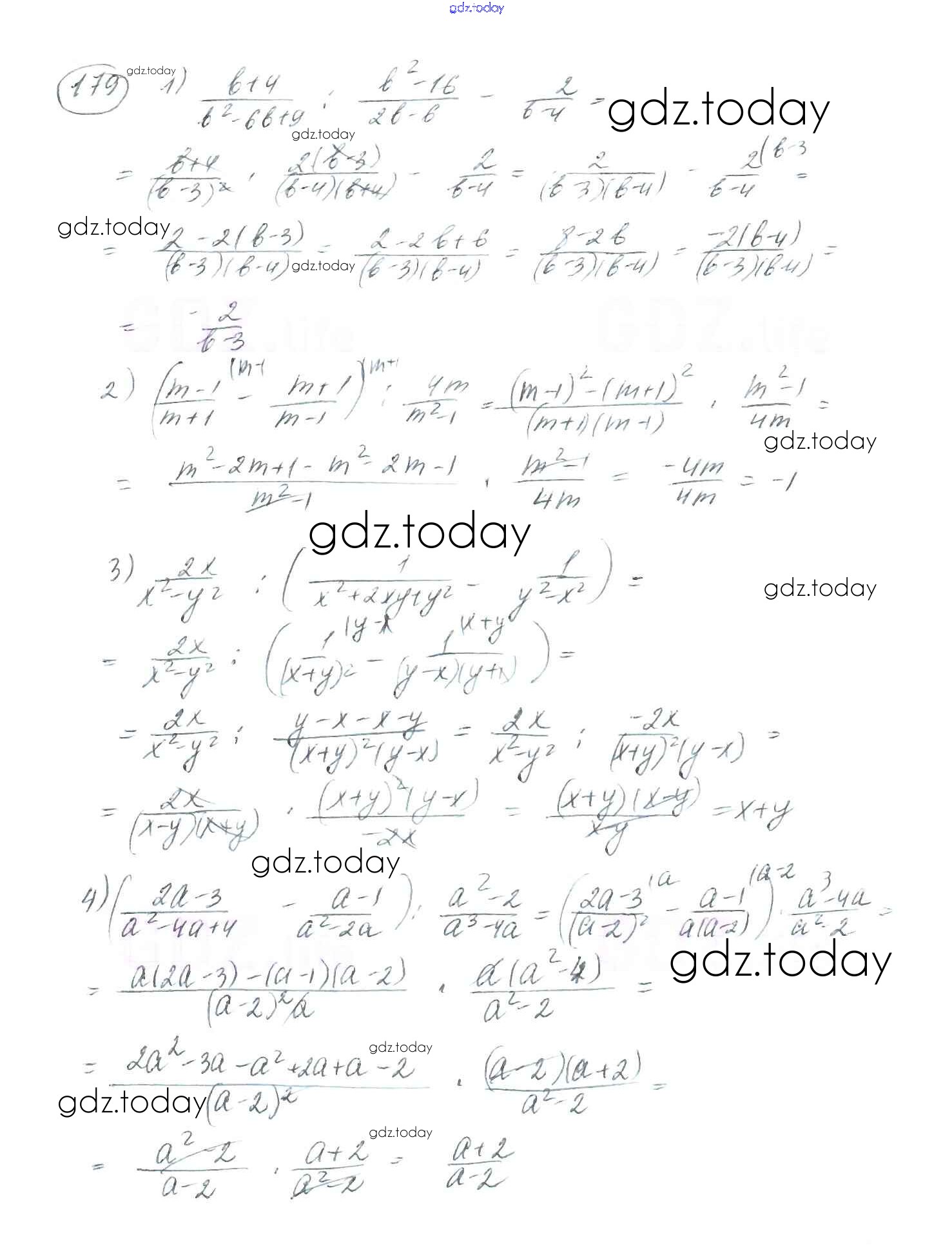 На страницах сайта gdz.today вы найдете учебный и вспомогательный материал, направленный на улучшения знаний школьной программы. ГДЗ - онлайн мир знаний §6. Тождественные преобразования рациональных выражений Решение к главе 1. Рациональные выражения 179 Учебнику по Алгебре для 8 класса Мерзляк, Полонский Вентана-граф Алгоритм успеха 2016