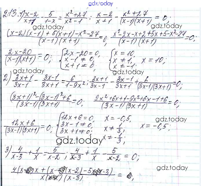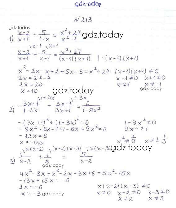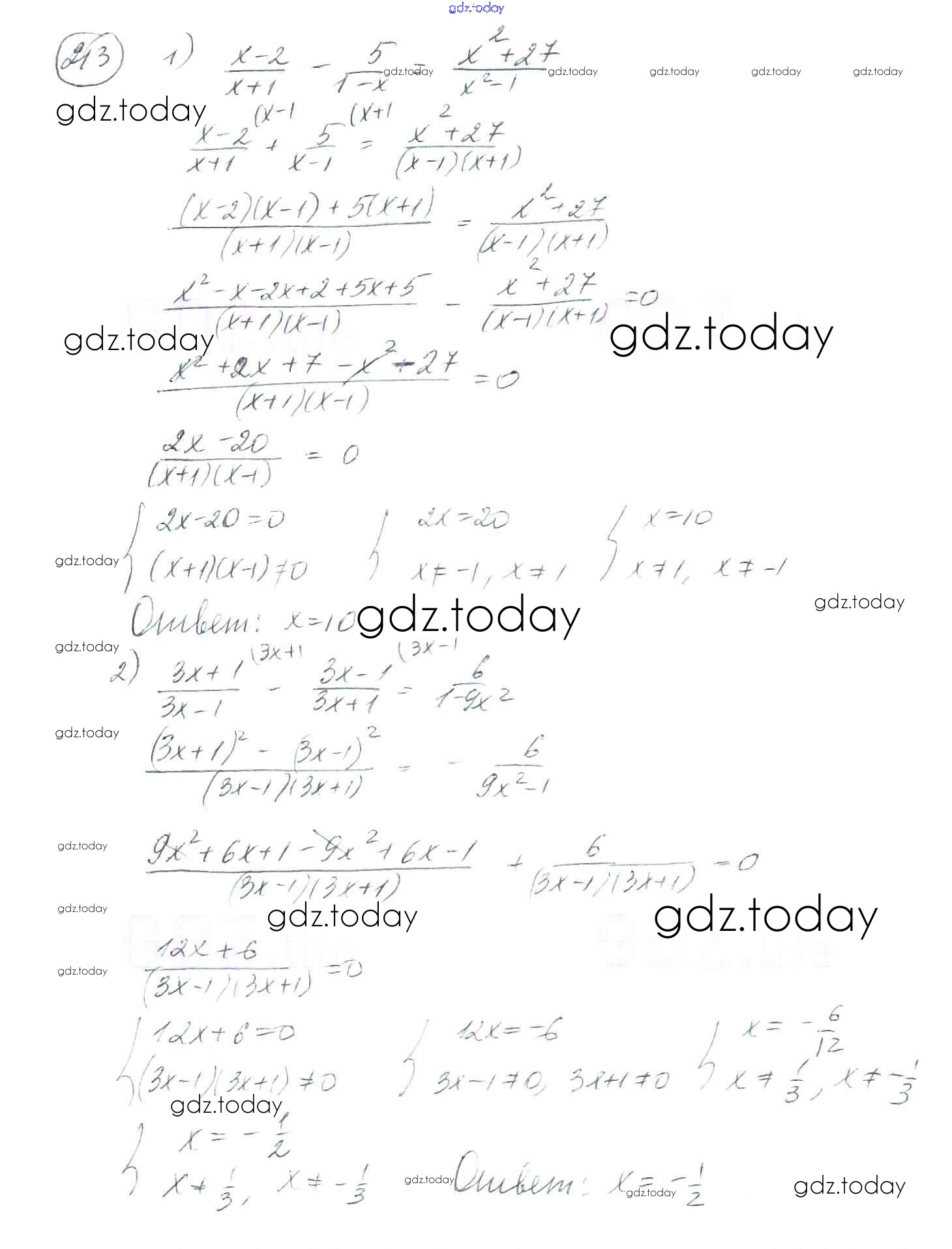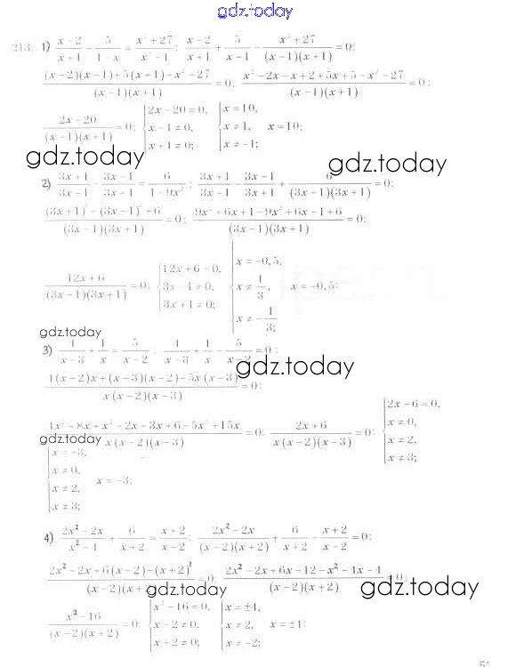На страницах сайта gdz.today вы найдете учебный и вспомогательный материал, направленный на улучшения знаний школьной программы. ГДЗ - онлайн мир знаний §7. Равносильные уравнения. Рациональные уравнения Решение к главе 1. Рациональные выражения 213 Учебнику по Алгебре для 8 класса Мерзляк, Полонский Вентана-граф Алгоритм успеха 2016