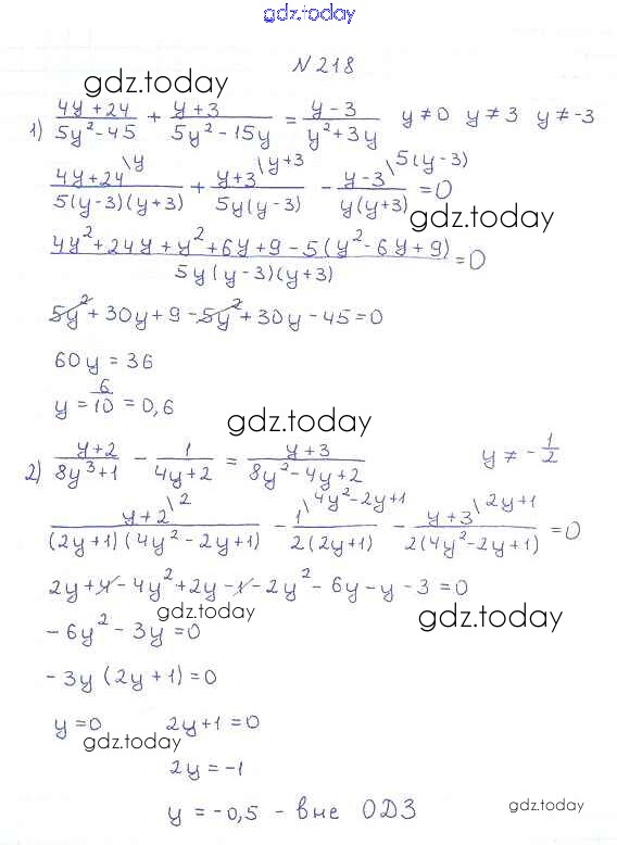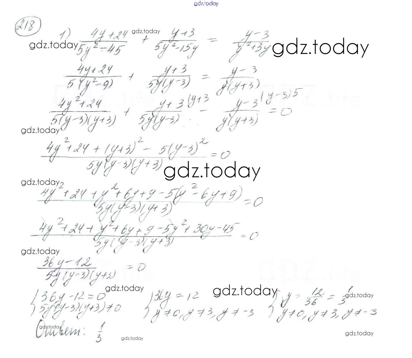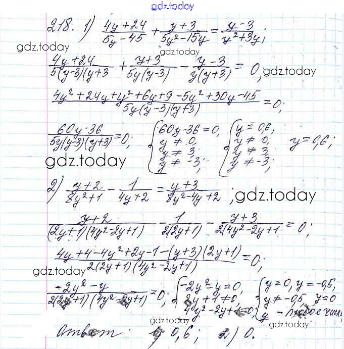 На страницах сайта gdz.today вы найдете учебный и вспомогательный материал, направленный на улучшения знаний школьной программы. ГДЗ - онлайн мир знаний §7. Равносильные уравнения. Рациональные уравнения Решение к главе 1. Рациональные выражения 218 Учебнику по Алгебре для 8 класса Мерзляк, Полонский Вентана-граф Алгоритм успеха 2016