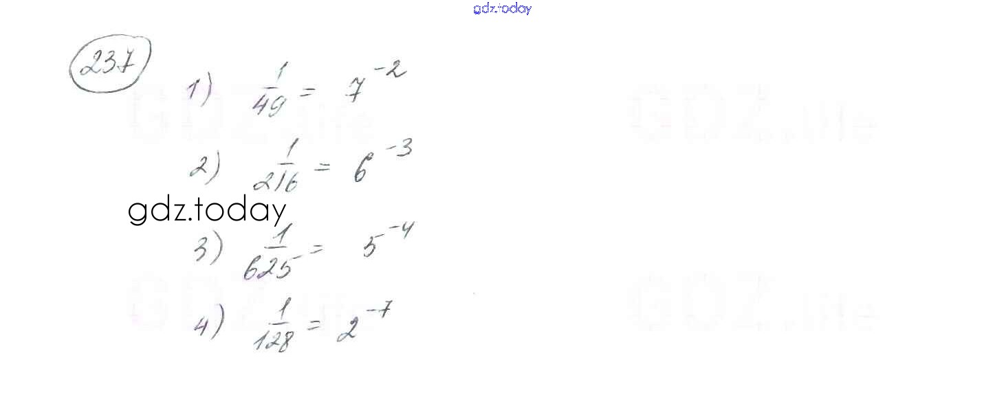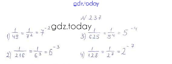 На страницах сайта gdz.today вы найдете учебный и вспомогательный материал, направленный на улучшения знаний школьной программы. ГДЗ - онлайн мир знаний §8. Степень с целым отрицательным показателем Решение к главе 1. Рациональные выражения 237 Учебнику по Алгебре для 8 класса Мерзляк, Полонский Вентана-граф Алгоритм успеха 2016