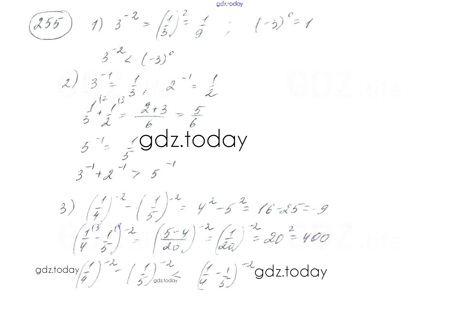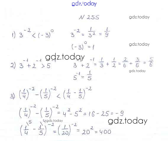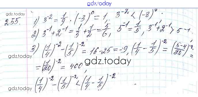 На страницах сайта gdz.today вы найдете учебный и вспомогательный материал, направленный на улучшения знаний школьной программы. ГДЗ - онлайн мир знаний §8. Степень с целым отрицательным показателем Решение к главе 1. Рациональные выражения 255 Учебнику по Алгебре для 8 класса Мерзляк, Полонский Вентана-граф Алгоритм успеха 2016
