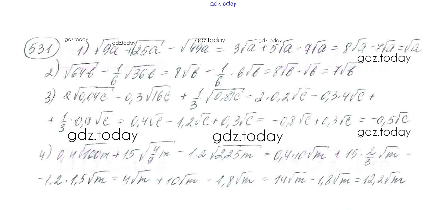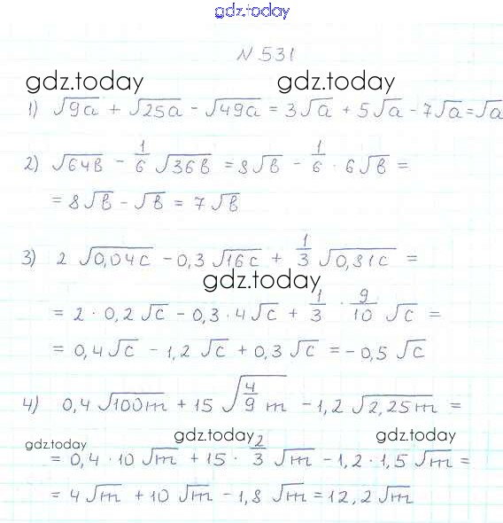 На страницах сайта gdz.today вы найдете учебный и вспомогательный материал, направленный на улучшения знаний школьной программы. ГДЗ - онлайн мир знаний §17. Тождественные преобразования выражений, содержащих арифметические квадратные корни Решение к главе 2. Квадратные корни. Действительные числа 531 Учебнику по Алгебре для 8 класса Мерзляк, Полонский Вентана-граф Алгоритм успеха 2016