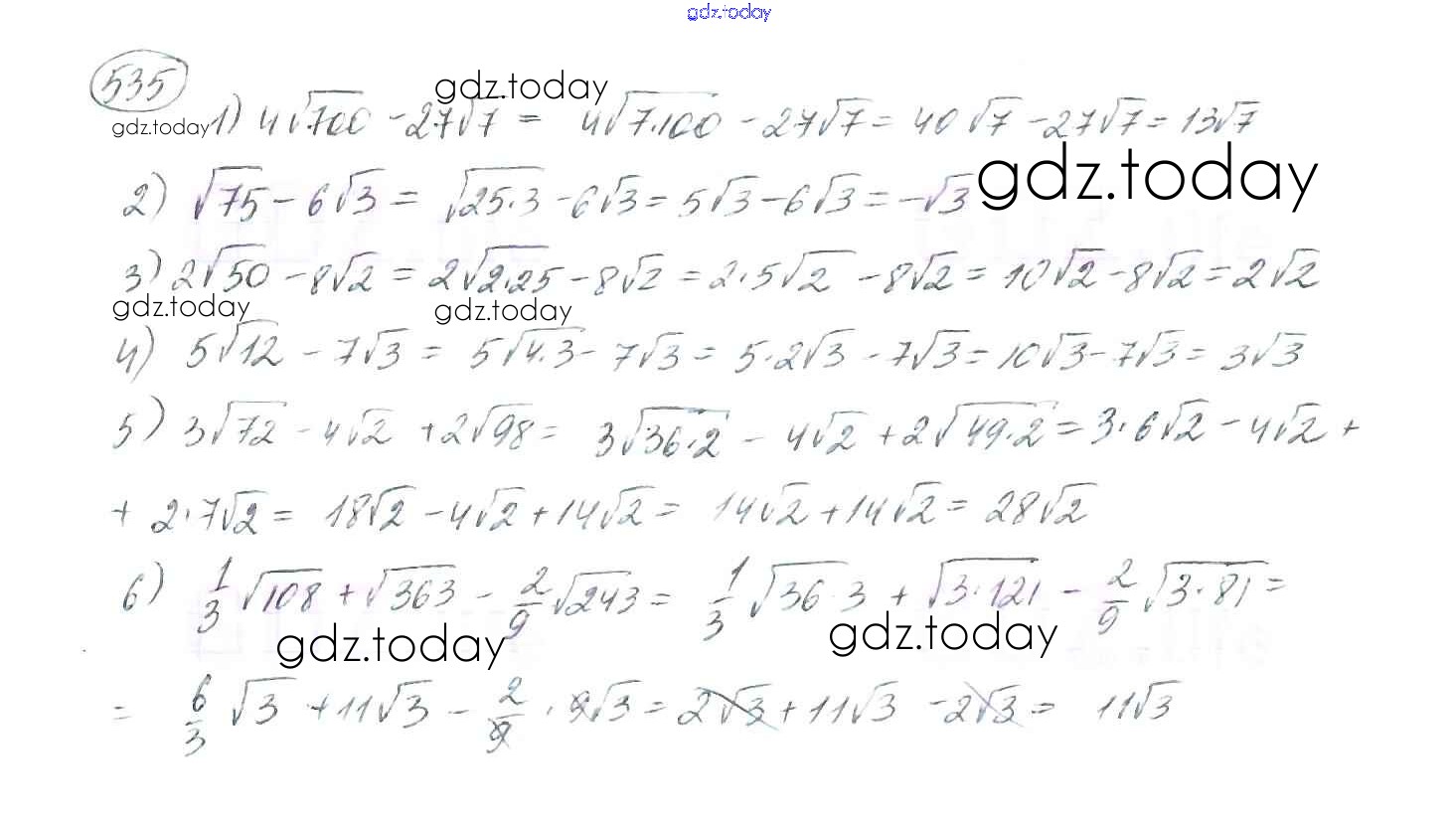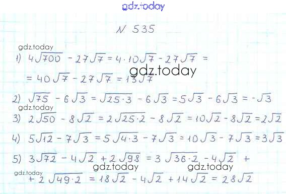 На страницах сайта gdz.today вы найдете учебный и вспомогательный материал, направленный на улучшения знаний школьной программы. ГДЗ - онлайн мир знаний §17. Тождественные преобразования выражений, содержащих арифметические квадратные корни Решение к главе 2. Квадратные корни. Действительные числа 535 Учебнику по Алгебре для 8 класса Мерзляк, Полонский Вентана-граф Алгоритм успеха 2016