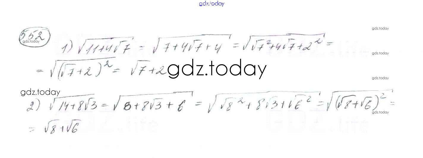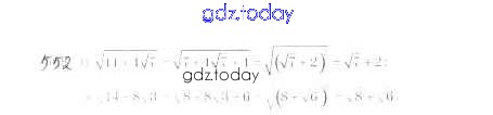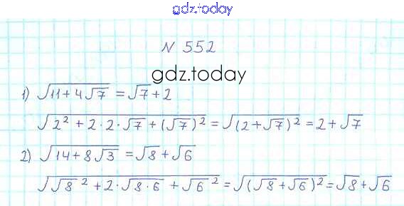 На страницах сайта gdz.today вы найдете учебный и вспомогательный материал, направленный на улучшения знаний школьной программы. ГДЗ - онлайн мир знаний §17. Тождественные преобразования выражений, содержащих арифметические квадратные корни Решение к главе 2. Квадратные корни. Действительные числа 552 Учебнику по Алгебре для 8 класса Мерзляк, Полонский Вентана-граф Алгоритм успеха 2016