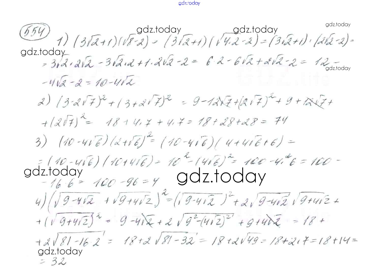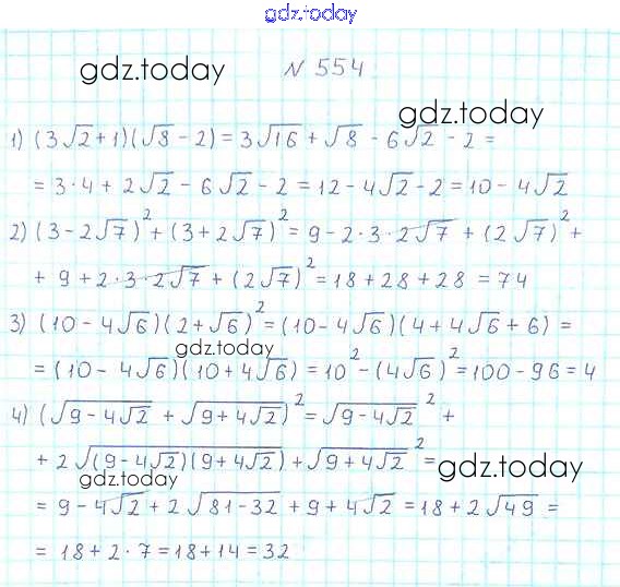 На страницах сайта gdz.today вы найдете учебный и вспомогательный материал, направленный на улучшения знаний школьной программы. ГДЗ - онлайн мир знаний §17. Тождественные преобразования выражений, содержащих арифметические квадратные корни Решение к главе 2. Квадратные корни. Действительные числа 554 Учебнику по Алгебре для 8 класса Мерзляк, Полонский Вентана-граф Алгоритм успеха 2016