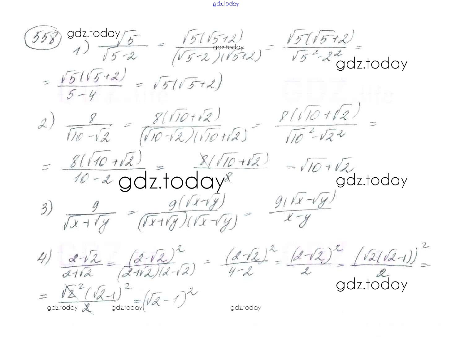 На страницах сайта gdz.today вы найдете учебный и вспомогательный материал, направленный на улучшения знаний школьной программы. ГДЗ - онлайн мир знаний §17. Тождественные преобразования выражений, содержащих арифметические квадратные корни Решение к главе 2. Квадратные корни. Действительные числа 558 Учебнику по Алгебре для 8 класса Мерзляк, Полонский Вентана-граф Алгоритм успеха 2016