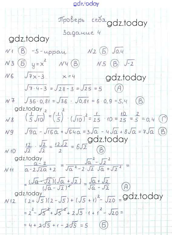 На страницах сайта gdz.today вы найдете учебный и вспомогательный материал, направленный на улучшения знаний школьной программы. ГДЗ - онлайн мир знаний Проверь себя №4 Решение к главе 2. Квадратные корни. Действительные числа 1 Учебнику по Алгебре для 8 класса Мерзляк, Полонский Вентана-граф Алгоритм успеха 2016