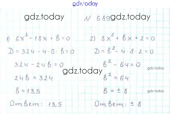Ответы к §20. Формула корней квадратного уравнения Решение к главе 3. Квадратные уравнения 689 Учебнику по Алгебре для 8 класса Мерзляк, Полонский Вентана-граф Алгоритм успеха 2016
