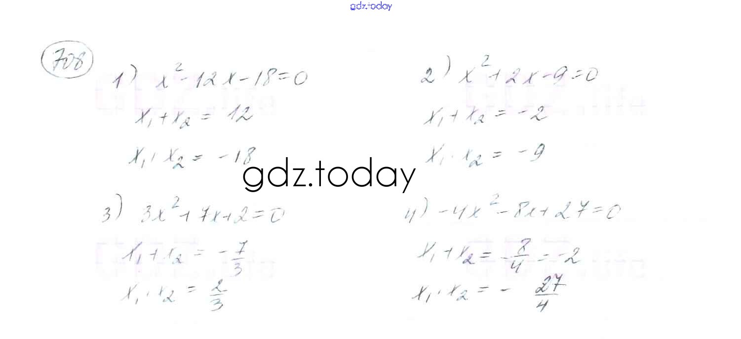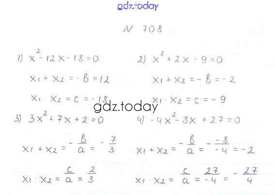 На страницах сайта gdz.today вы найдете учебный и вспомогательный материал, направленный на улучшения знаний школьной программы. ГДЗ - онлайн мир знаний §21. Теорема Виета Решение к главе 3. Квадратные уравнения 708 Учебнику по Алгебре для 8 класса Мерзляк, Полонский Вентана-граф Алгоритм успеха 2016