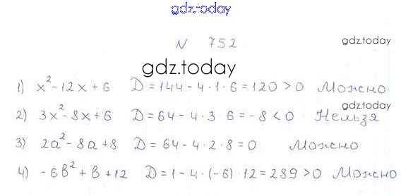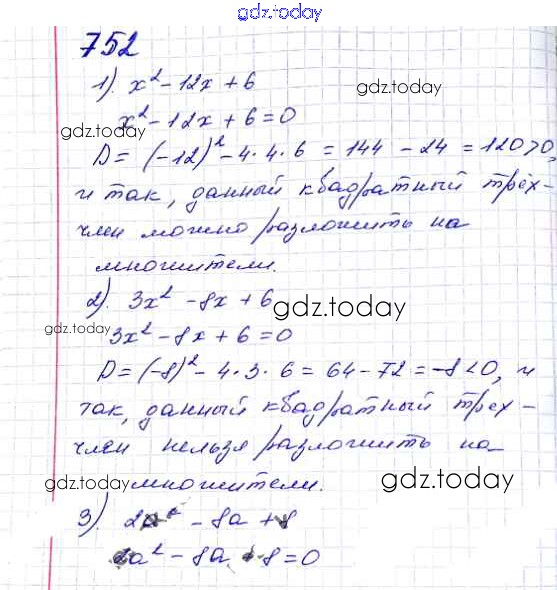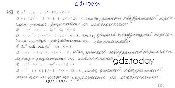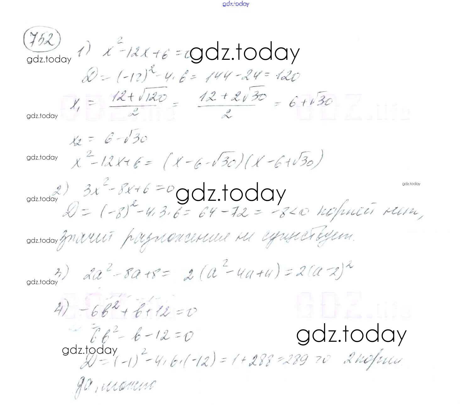 На страницах сайта gdz.today вы найдете учебный и вспомогательный материал, направленный на улучшения знаний школьной программы. ГДЗ - онлайн мир знаний §22. Квадратный трёхчлен Решение к главе 3. Квадратные уравнения 752 Учебнику по Алгебре для 8 класса Мерзляк, Полонский Вентана-граф Алгоритм успеха 2016