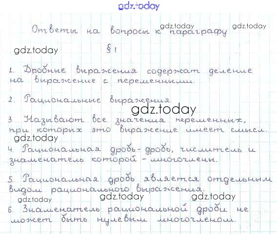 На страницах сайта gdz.today вы найдете учебный и вспомогательный материал, направленный на улучшения знаний школьной программы. ГДЗ - онлайн мир знаний Вопросы к параграфу §1 Учебнику по Алгебре для 8 класса Мерзляк, Полонский Вентана-граф Алгоритм успеха 2016