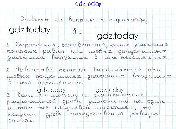 На страницах сайта gdz.today вы найдете учебный и вспомогательный материал, направленный на улучшения знаний школьной программы. ГДЗ - онлайн мир знаний Вопросы к параграфу §2 Учебнику по Алгебре для 8 класса Мерзляк, Полонский Вентана-граф Алгоритм успеха 2016