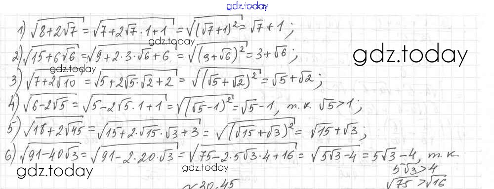 На страницах сайта gdz.today вы найдете учебный и вспомогательный материал, направленный на улучшения знаний школьной программы. ГДЗ - онлайн мир знаний §30. Тождественные преобразования выражений, содержащих арифметические квадратные корни Решение к главе 5. Квадратные корни. Действительные числа 44 Учебнику по Алгебре для 8 класса Мерзляк, Поляков Углубленный уровень Вентана-граф Алгоритм успеха 2020