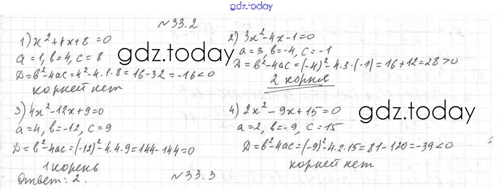 На страницах сайта gdz.today вы найдете учебный и вспомогательный материал, направленный на улучшения знаний школьной программы. ГДЗ - онлайн мир знаний §33. Формула корней квадратного уравнения Решение к главе 6. Квадратные уравнения 2 Учебнику по Алгебре для 8 класса Мерзляк, Поляков Углубленный уровень Вентана-граф Алгоритм успеха 2020