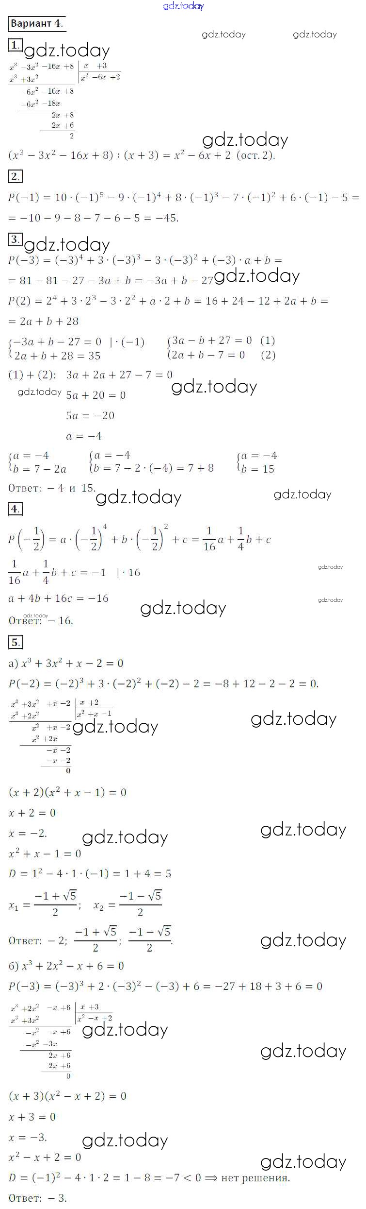 Ответы к СР №11. Делимость многочленов Решение к самостоятельным работам вариант 4 Дидактическим материалам по Алгебре для 8 класса Потапов, Шевкин Просвещение МГУ - школе 2017