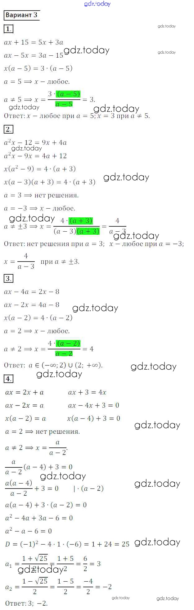 Ответы к СР №12. Линейные уравнения с параметром Решение к самостоятельным работам вариант 3 Дидактическим материалам по Алгебре для 8 класса Потапов, Шевкин Просвещение МГУ - школе 2017