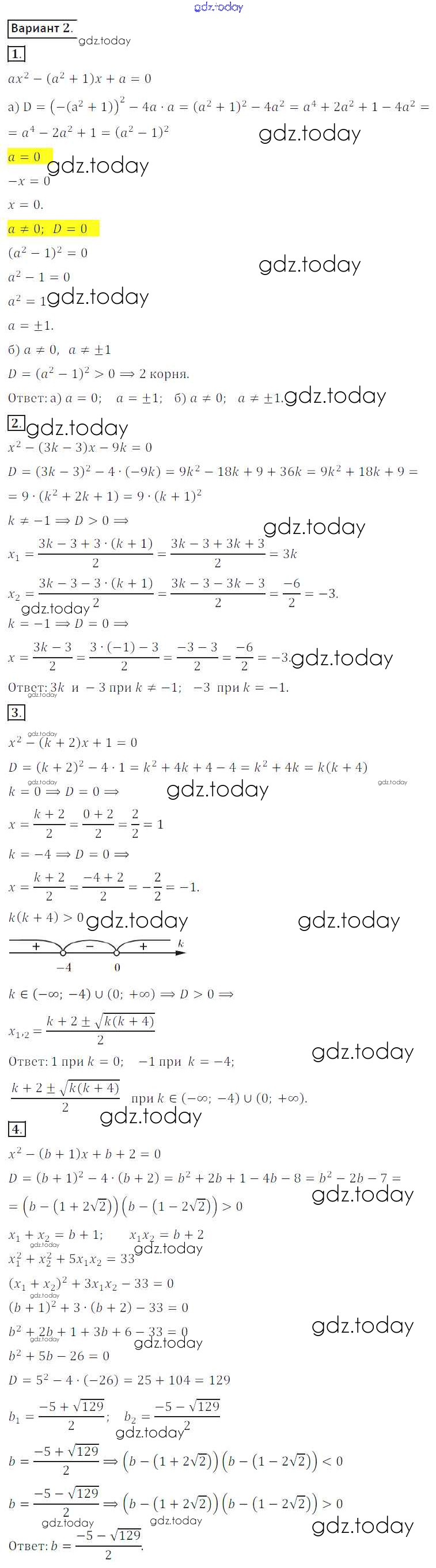 Ответы к СР №13. Квадратные уравнения с параметром Решение к самостоятельным работам вариант 2 Дидактическим материалам по Алгебре для 8 класса Потапов, Шевкин Просвещение МГУ - школе 2017