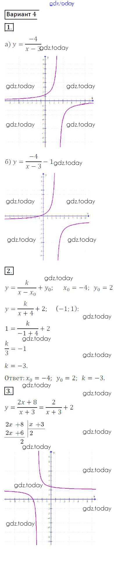 Ответы к СР №18. Функция у = k:х-х₀ + y₀ Решение к самостоятельным работам вариант 4 Дидактическим материалам по Алгебре для 8 класса Потапов, Шевкин Просвещение МГУ - школе 2017