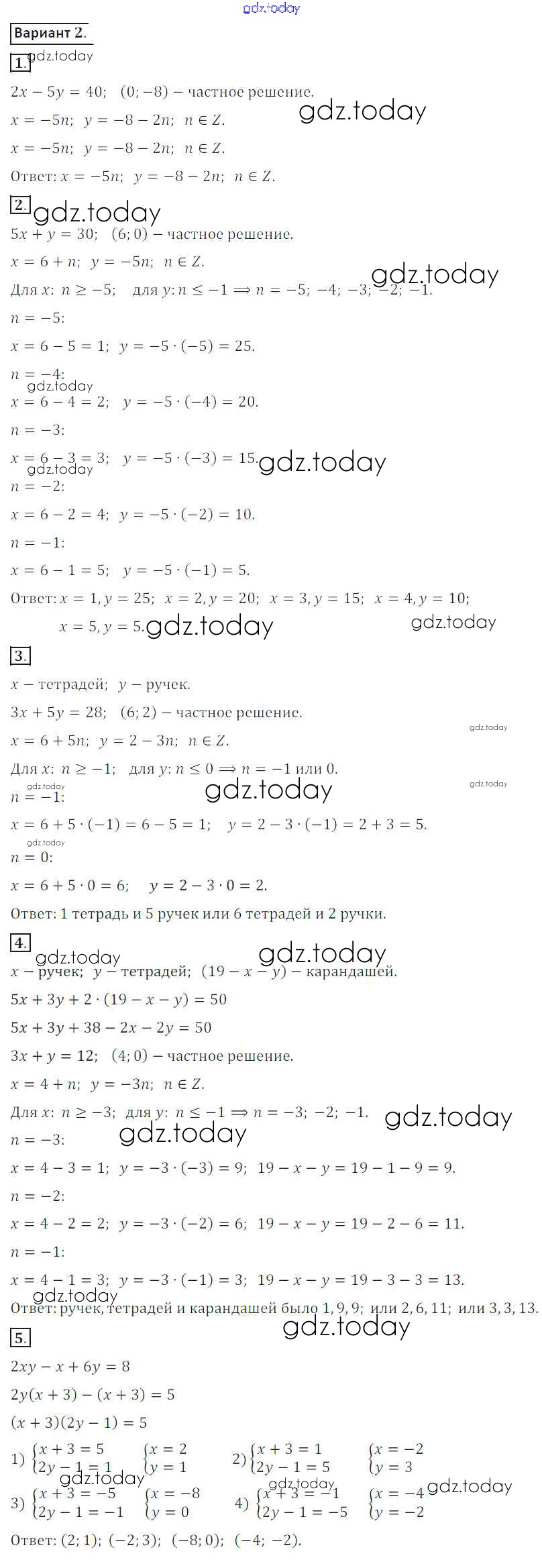 Ответы к СР №26. Решение уравнений в целых числах Решение к самостоятельным работам вариант 2 Дидактическим материалам по Алгебре для 8 класса Потапов, Шевкин Просвещение МГУ - школе 2017