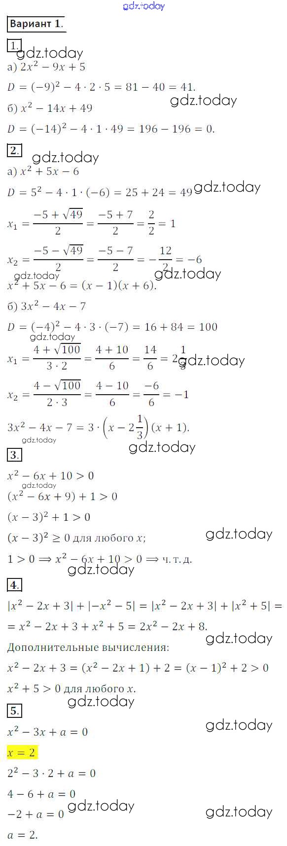 Ответы к СР №5. Квадратный трехчлен Решение к самостоятельным работам вариант 1 Дидактическим материалам по Алгебре для 8 класса Потапов, Шевкин Просвещение МГУ - школе 2017