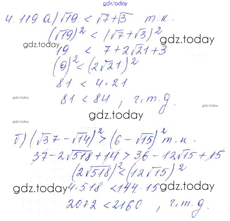 На страницах сайта gdz.today вы найдете учебный и вспомогательный материал, направленный на улучшения знаний школьной программы. ГДЗ - онлайн мир знаний Решение к параграфам 4. Квадратные корни 4.119 Сборнику задач по Алгебре для 8 класса Галицкий, Гольдман Просвещение 2019