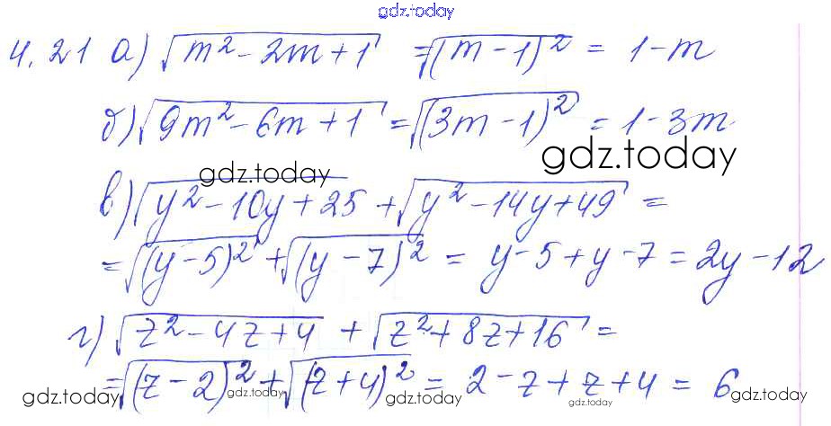 На страницах сайта gdz.today вы найдете учебный и вспомогательный материал, направленный на улучшения знаний школьной программы. ГДЗ - онлайн мир знаний Решение к параграфам 4. Квадратные корни 4.21 Сборнику задач по Алгебре для 8 класса Галицкий, Гольдман Просвещение 2019
