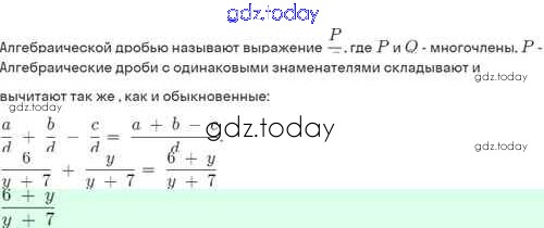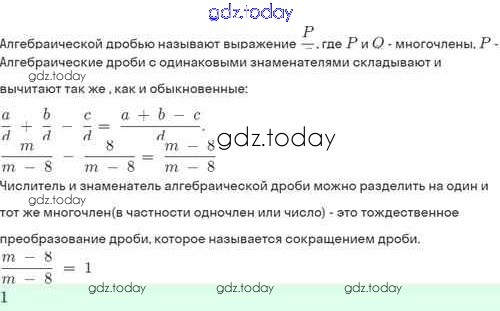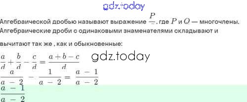 На страницах сайта gdz.today вы найдете учебный и вспомогательный материал, направленный на улучшения знаний школьной программы. ГДЗ - онлайн мир знаний Решение. §3. Сложение и вычитание алгебраических дробей с одинаковыми знаменателями 3.6 Задачнику по Алгебре для 8 класса Мордкович, Александрова Базовый уровень Мнемозина 2021