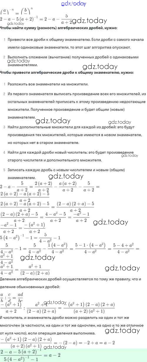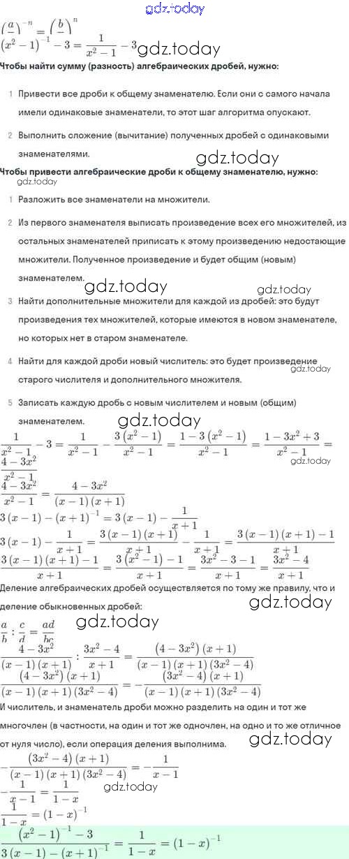 На страницах сайта gdz.today вы найдете учебный и вспомогательный материал, направленный на улучшения знаний школьной программы. ГДЗ - онлайн мир знаний Решение. §8. Степень с отрицательным целым показателем 8.24 Задачнику по Алгебре для 8 класса Мордкович, Александрова Базовый уровень Мнемозина 2021
