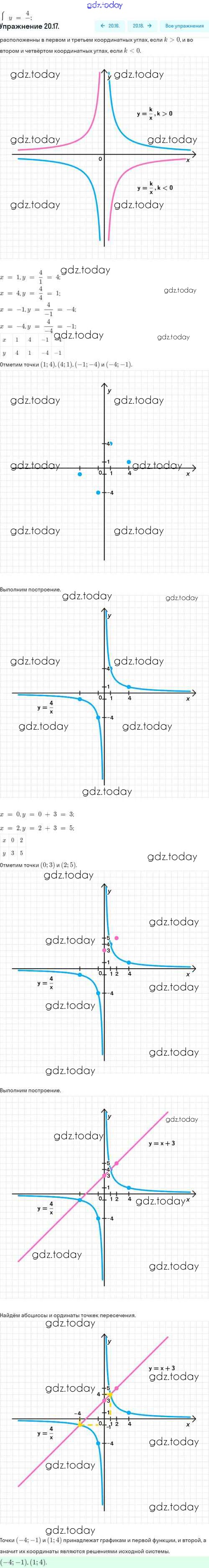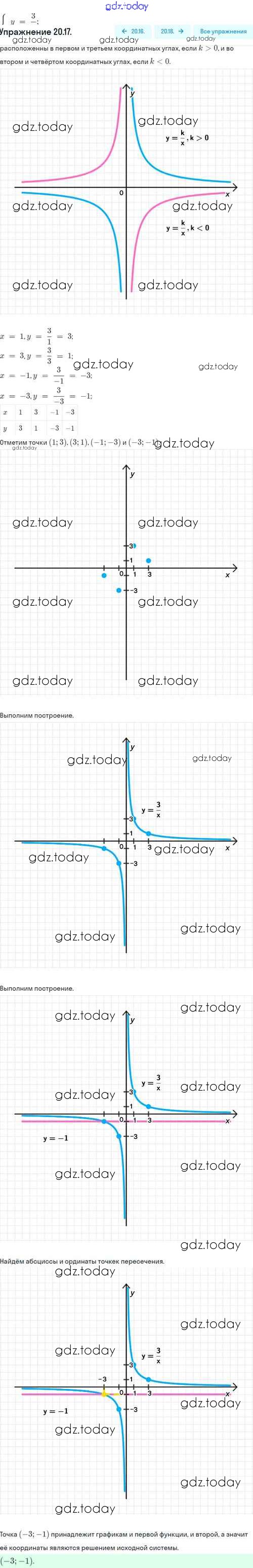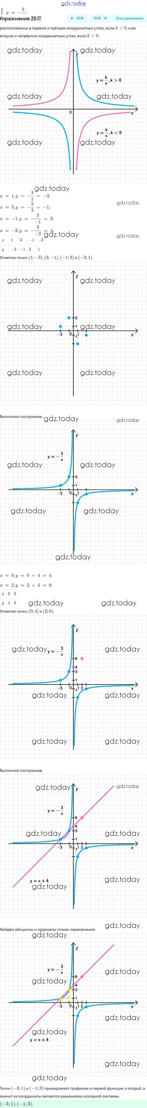 Ответы к Решение. §20. Функция y=k/x, её свойства и график 20.17 Задачнику по Алгебре для 8 класса Мордкович, Александрова Базовый уровень Мнемозина 2021