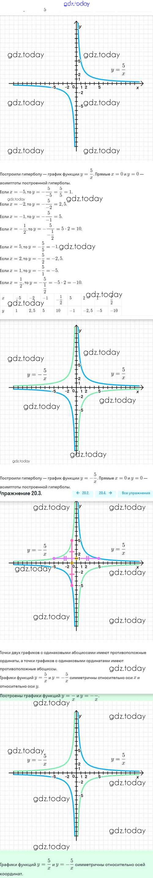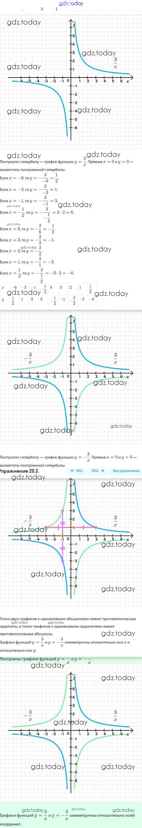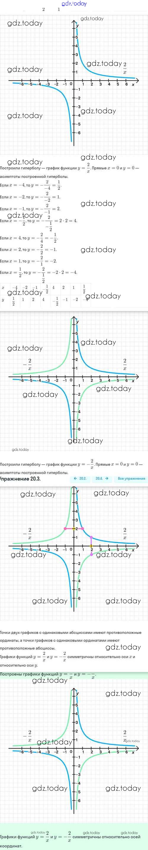 Ответы к Решение. §20. Функция y=k/x, её свойства и график 20.3 Задачнику по Алгебре для 8 класса Мордкович, Александрова Базовый уровень Мнемозина 2021