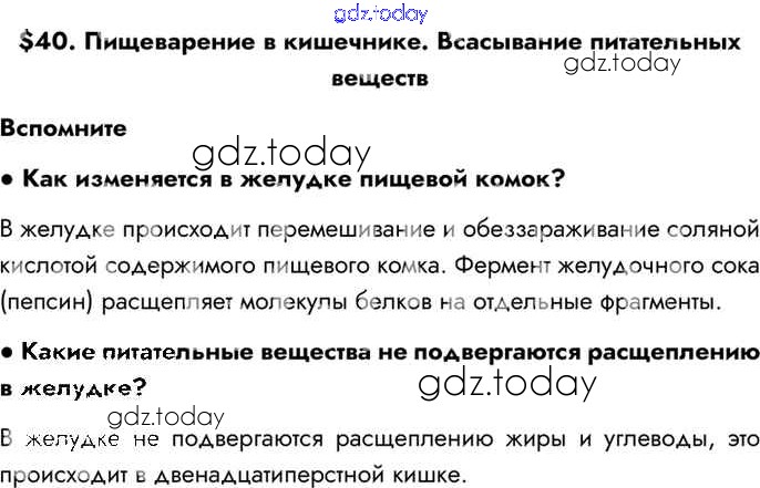 На страницах сайта gdz.today вы найдете учебный и вспомогательный материал, направленный на улучшения знаний школьной программы. ГДЗ - онлайн мир знаний §40 Решение к главе 7 Вспомним Учебнику по Биологии для 8 класса Драгомилов, Маш Просвещение Алгоритм успеха 2022