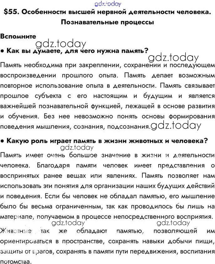 На страницах сайта gdz.today вы найдете учебный и вспомогательный материал, направленный на улучшения знаний школьной программы. ГДЗ - онлайн мир знаний §55 Решение к главе 10 Вспомним Учебнику по Биологии для 8 класса Драгомилов, Маш Просвещение Алгоритм успеха 2022