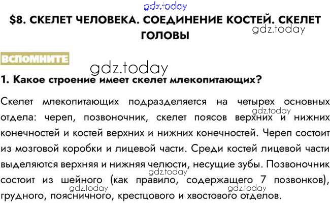 На страницах сайта gdz.today вы найдете учебный и вспомогательный материал, направленный на улучшения знаний школьной программы. ГДЗ - онлайн мир знаний Вспомните Решение к §8 1 Учебнику по Биологии для 8 класса Пасечник, Каменский Просвещение Линия жизни 2016