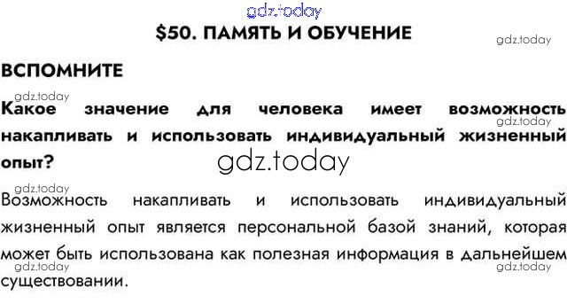 На страницах сайта gdz.today вы найдете учебный и вспомогательный материал, направленный на улучшения знаний школьной программы. ГДЗ - онлайн мир знаний Вспомните Решение к §50 1 Учебнику по Биологии для 8 класса Пасечник, Каменский Просвещение Линия жизни 2016
