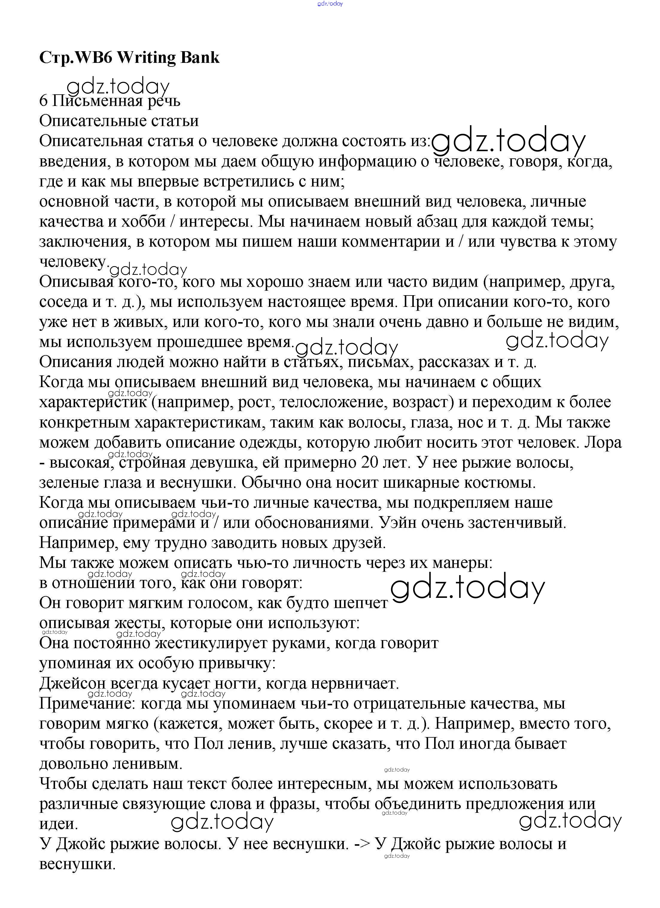 На страницах сайта gdz.today вы найдете учебный и вспомогательный материал, направленный на улучшения знаний школьной программы. ГДЗ - онлайн мир знаний Writing Bank (решение) WB6 Учебнику по Английскому языку для 8 класса Баранова, Дули Углубленный уровень Просвещение Starlight 2016