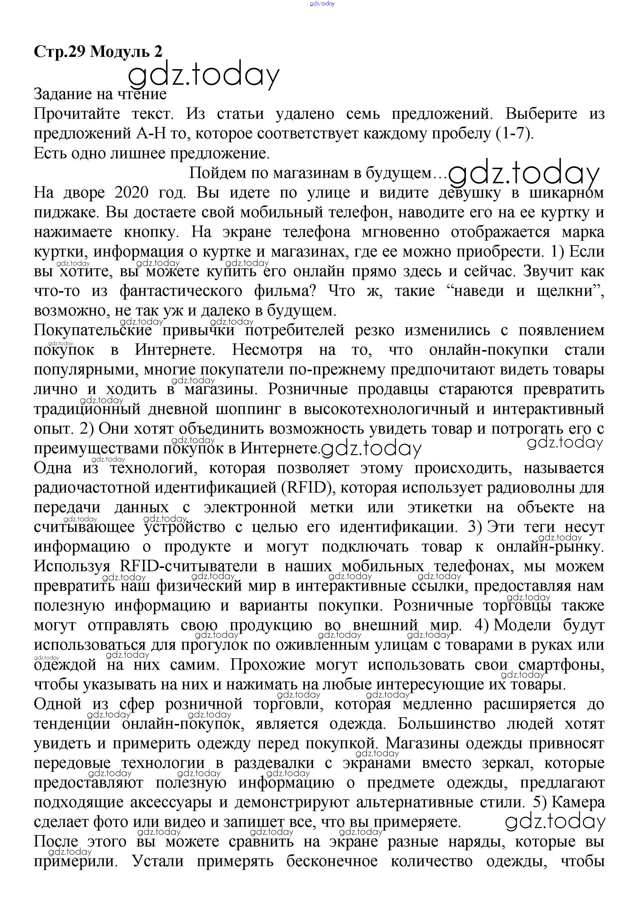 На страницах сайта gdz.today вы найдете учебный и вспомогательный материал, направленный на улучшения знаний школьной программы. ГДЗ - онлайн мир знаний Страницы (решение) 29 Рабочей тетради по Английскому языку для 8 класса Баранова, Дули Углубленный уровень Просвещение Starlight 2015