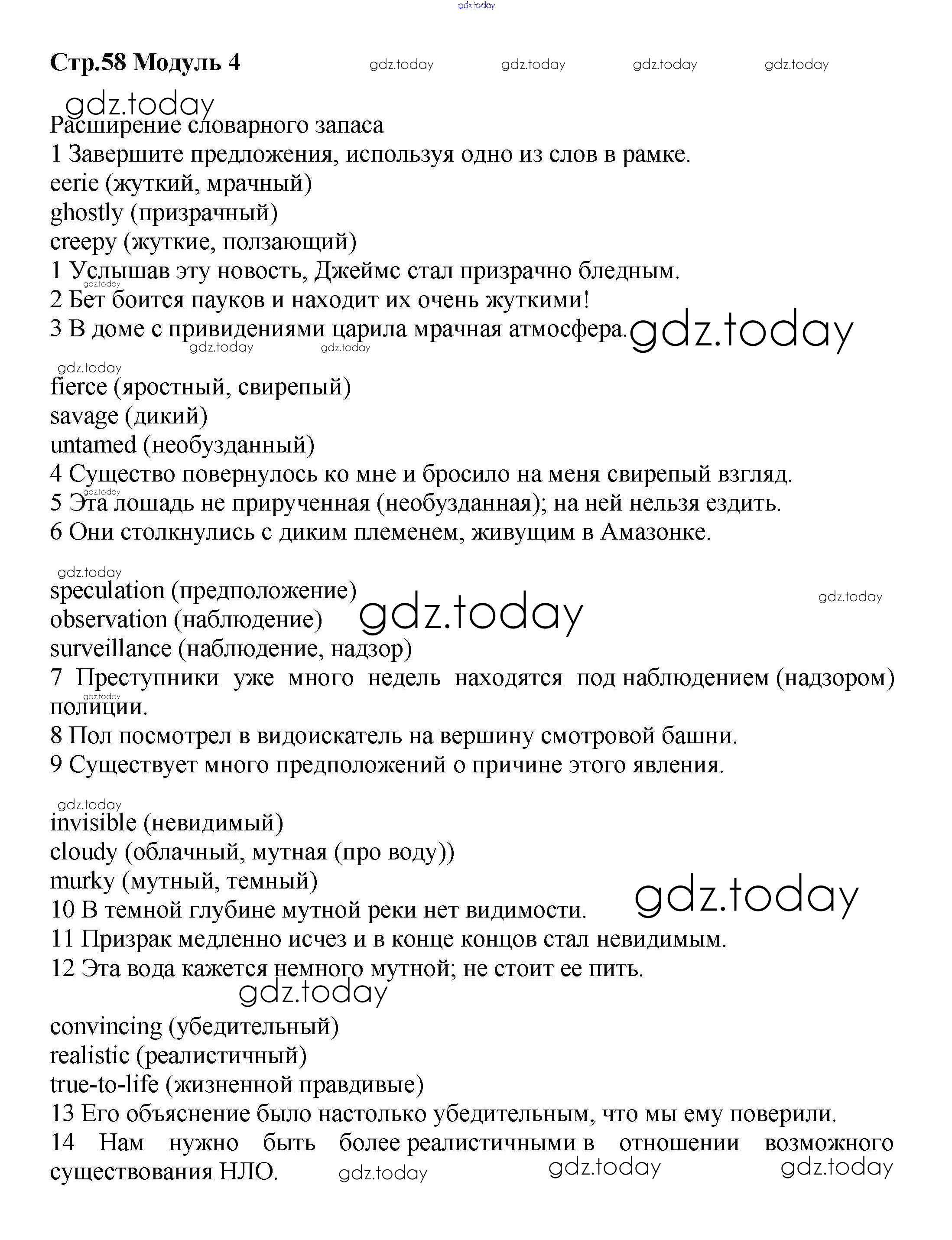 Ответы к Страницы (решение) 58 Рабочей тетради по Английскому языку для 8 класса Баранова, Дули Углубленный уровень Просвещение Starlight 2015