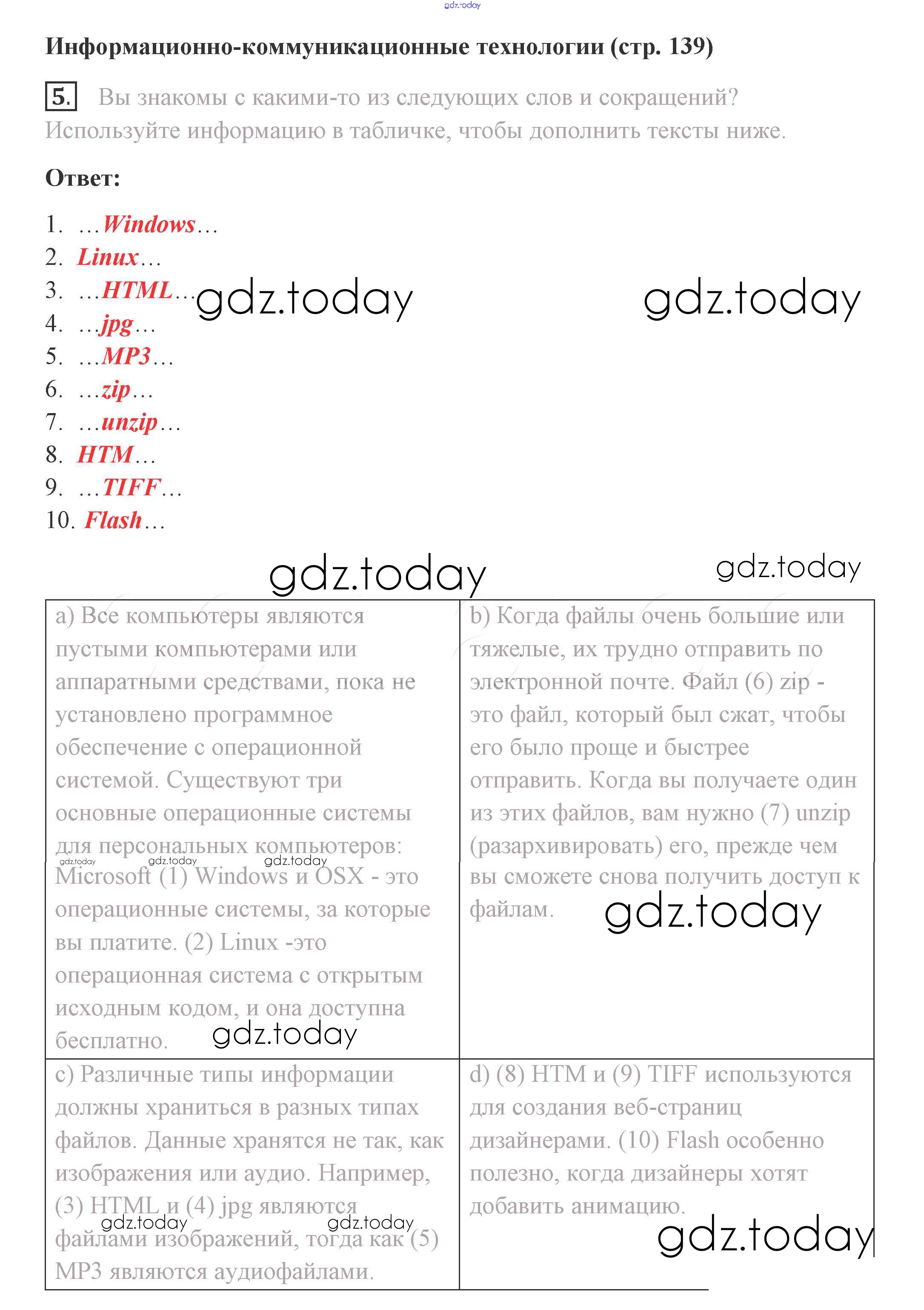 На страницах сайта gdz.today вы найдете учебный и вспомогательный материал, направленный на улучшения знаний школьной программы. ГДЗ - онлайн мир знаний Решение. Страницы 139 Учебнику по Английскому языку для 8 класса Комарова, Ларионова Русское слово Инновационная школа 2016