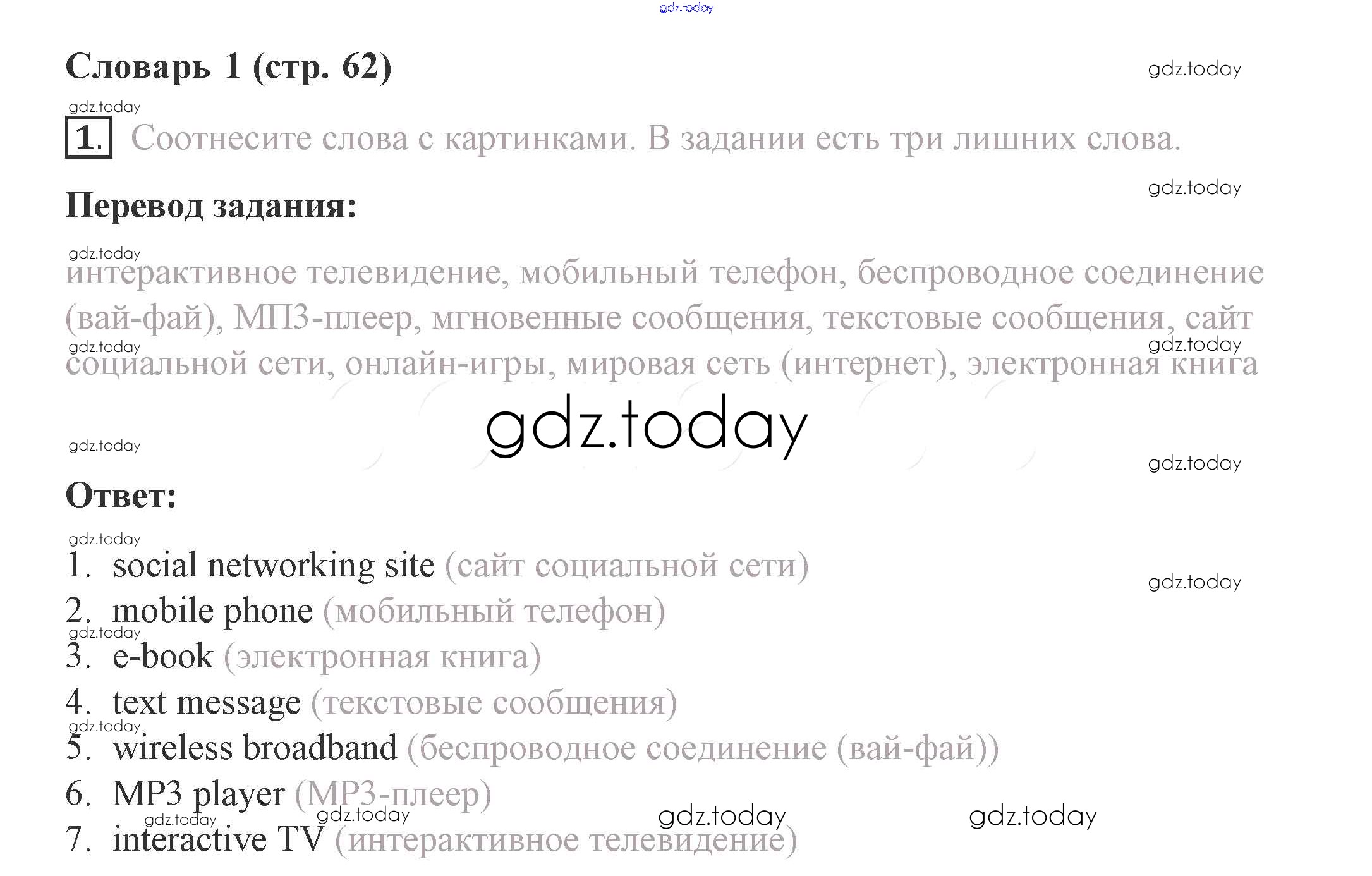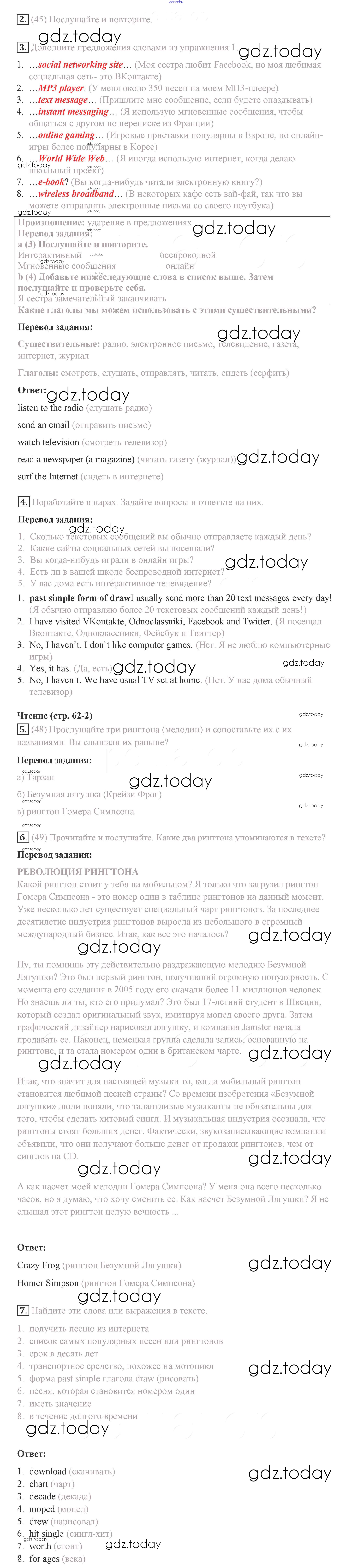 На страницах сайта gdz.today вы найдете учебный и вспомогательный материал, направленный на улучшения знаний школьной программы. ГДЗ - онлайн мир знаний Решение. Страницы 62 Учебнику по Английскому языку для 8 класса Комарова, Ларионова Русское слово Инновационная школа 2016