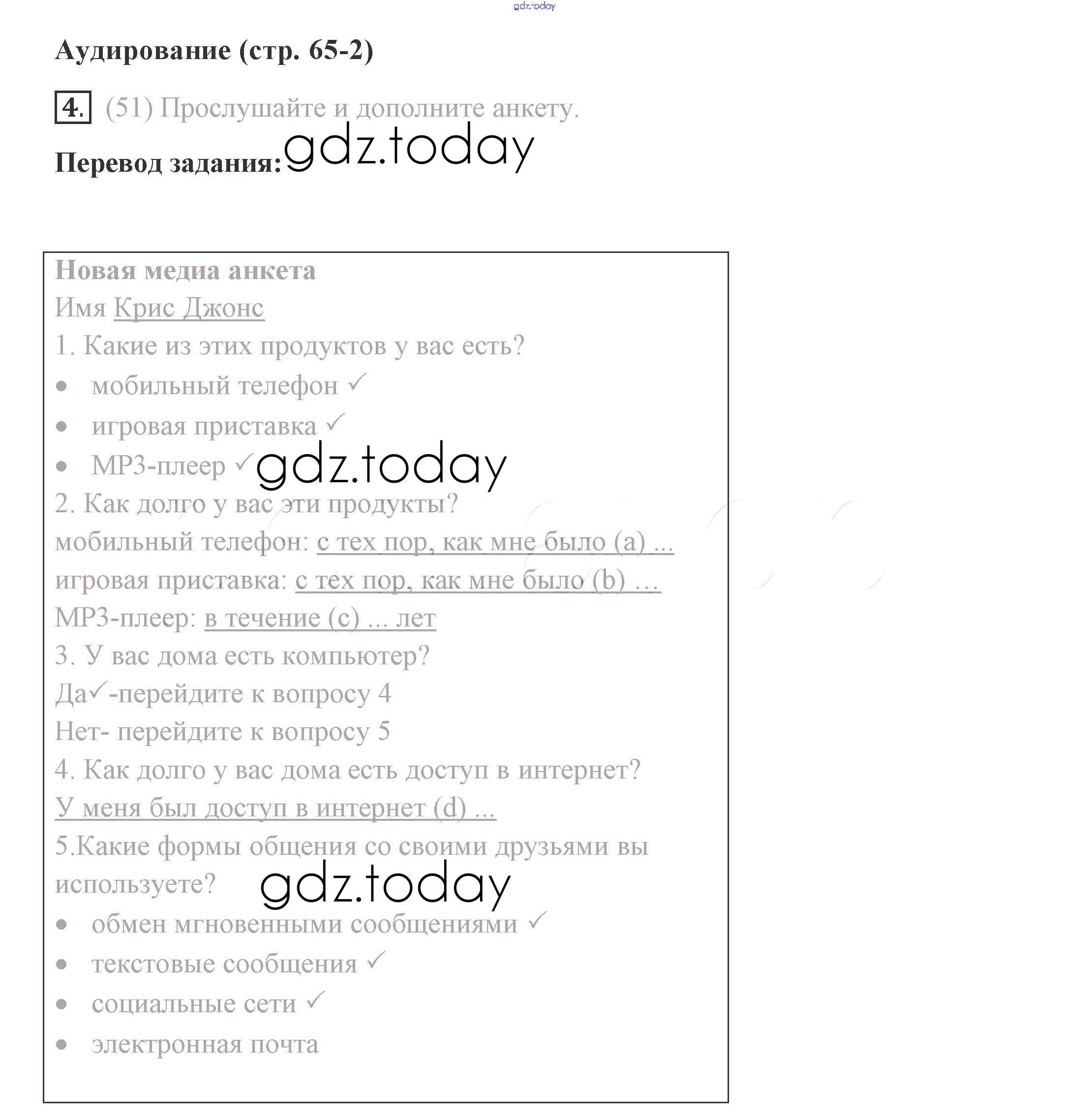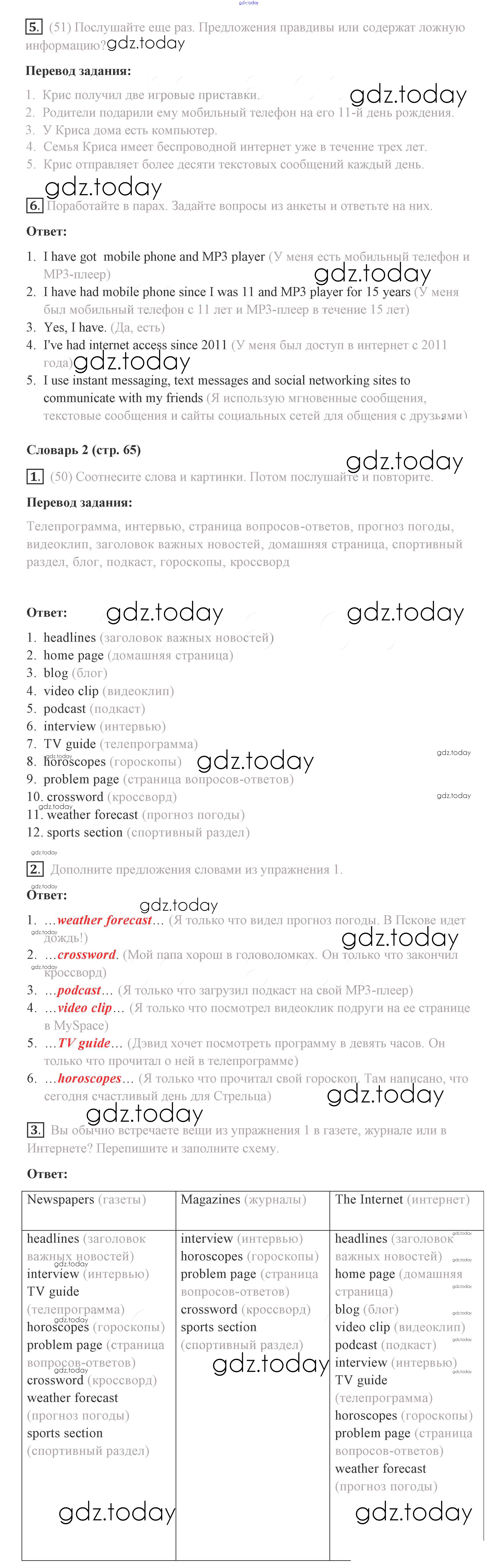 На страницах сайта gdz.today вы найдете учебный и вспомогательный материал, направленный на улучшения знаний школьной программы. ГДЗ - онлайн мир знаний Решение. Страницы 65 Учебнику по Английскому языку для 8 класса Комарова, Ларионова Русское слово Инновационная школа 2016