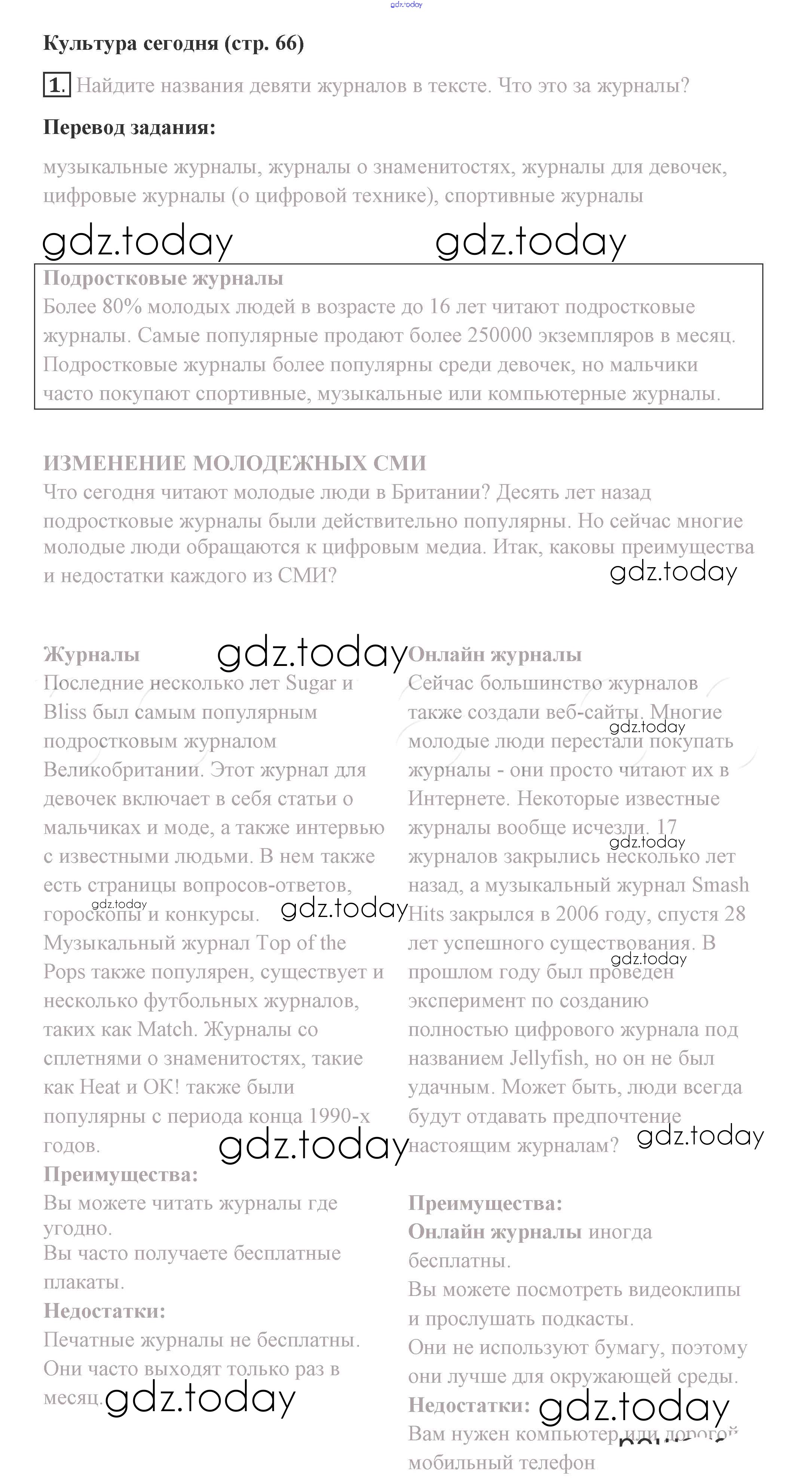 На страницах сайта gdz.today вы найдете учебный и вспомогательный материал, направленный на улучшения знаний школьной программы. ГДЗ - онлайн мир знаний Решение. Страницы 66 Учебнику по Английскому языку для 8 класса Комарова, Ларионова Русское слово Инновационная школа 2016