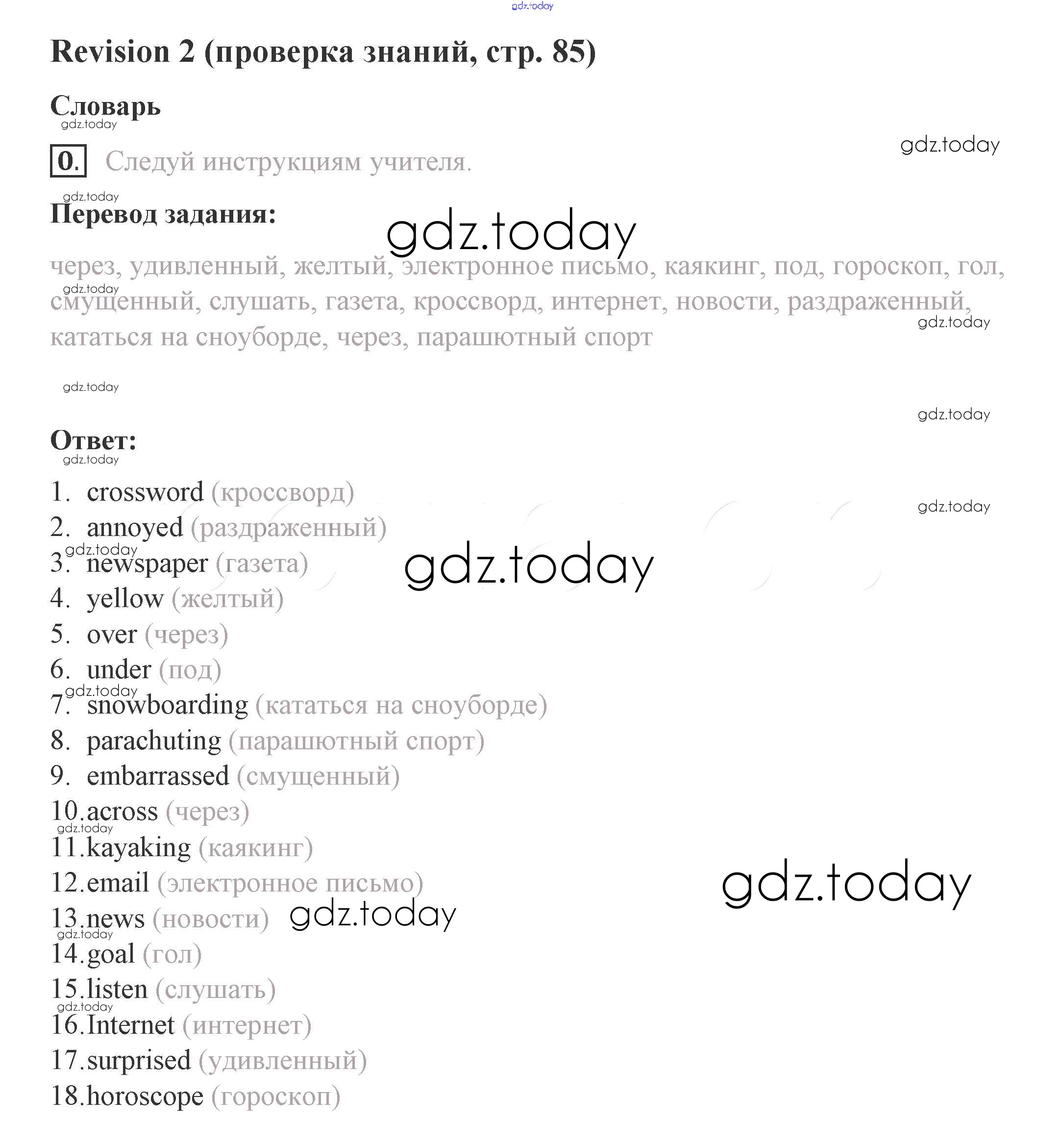 На страницах сайта gdz.today вы найдете учебный и вспомогательный материал, направленный на улучшения знаний школьной программы. ГДЗ - онлайн мир знаний Решение. Страницы 85 Учебнику по Английскому языку для 8 класса Комарова, Ларионова Русское слово Инновационная школа 2016