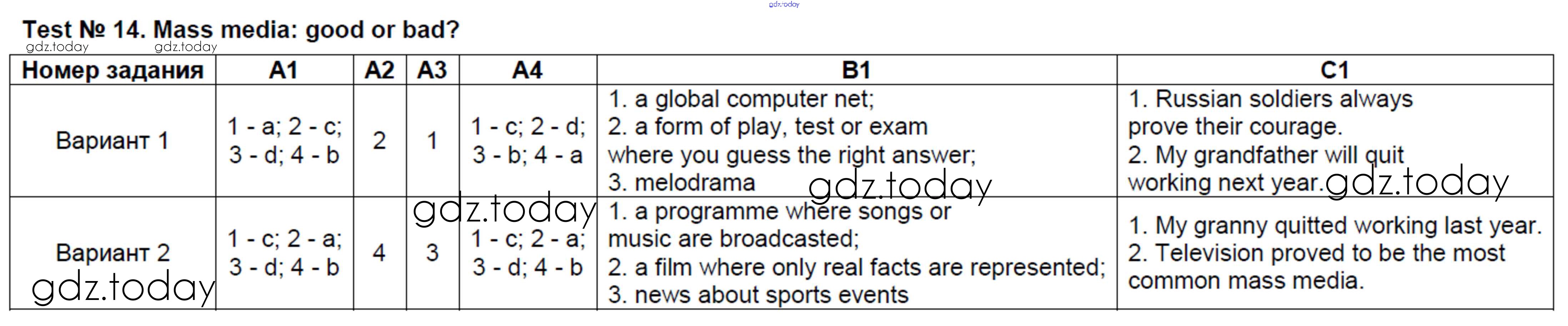 На страницах сайта gdz.today вы найдете учебный и вспомогательный материал, направленный на улучшения знаний школьной программы. ГДЗ - онлайн мир знаний Решение к тестам Test №14. Mass media - good or bad Контрольно-измерительным материалам (КИМ) по Английскому языку для 8 класса Лысакова ВАКО 2018