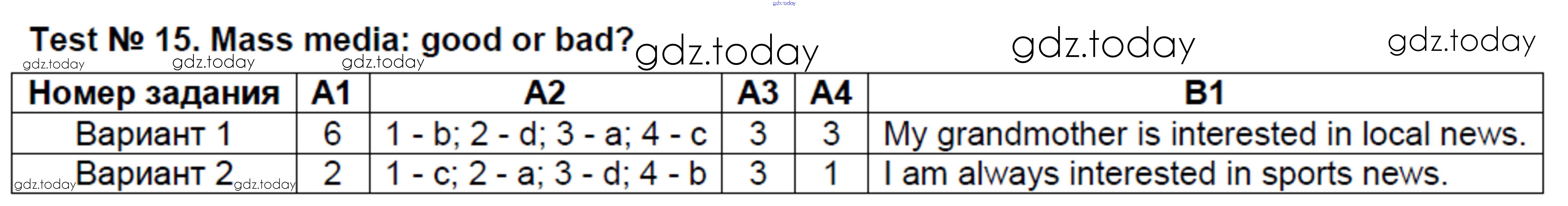Ответы к Решение к тестам Test №15. Mass media - good or bad Контрольно-измерительным материалам (КИМ) по Английскому языку для 8 класса Лысакова ВАКО 2018
