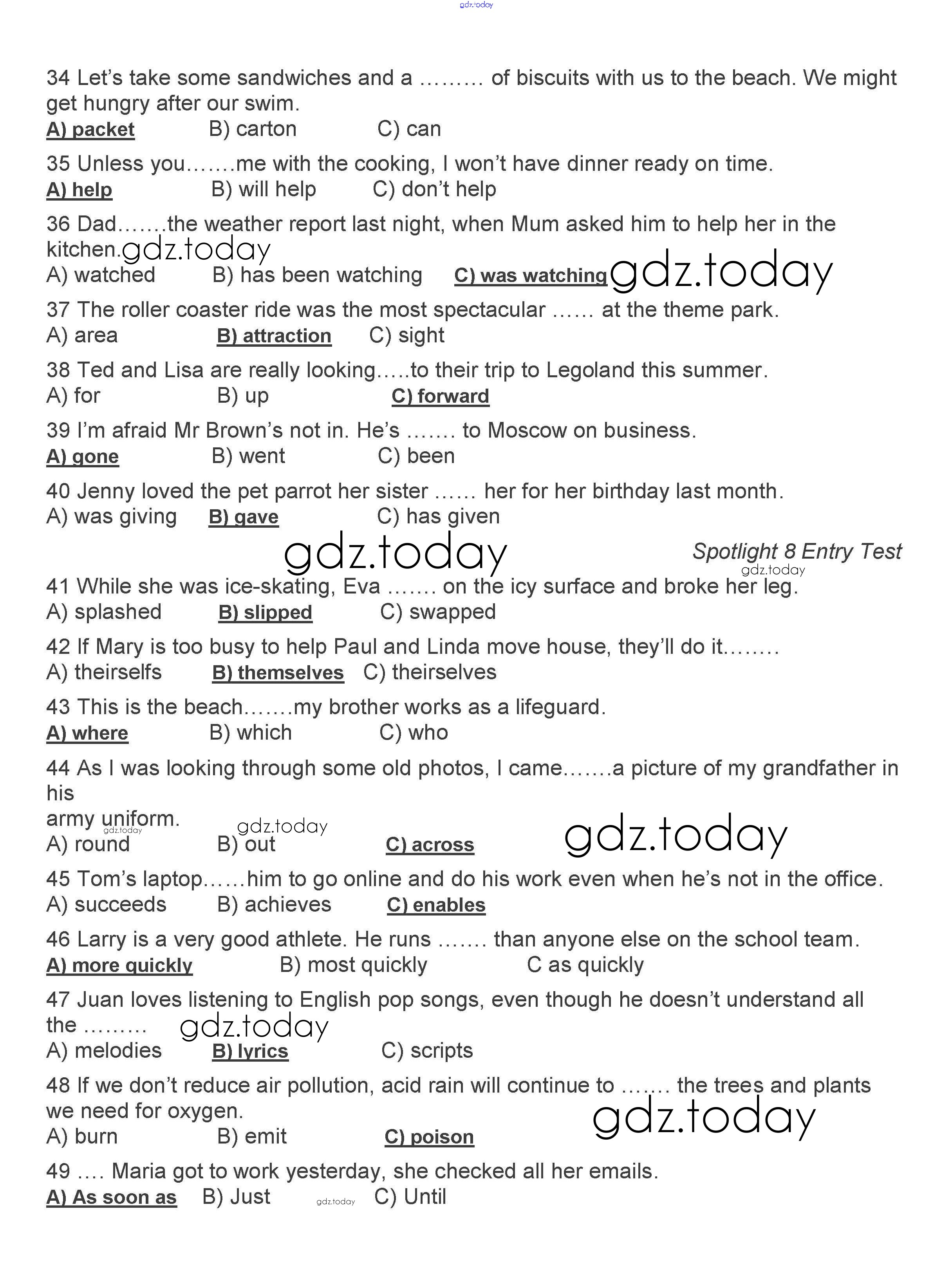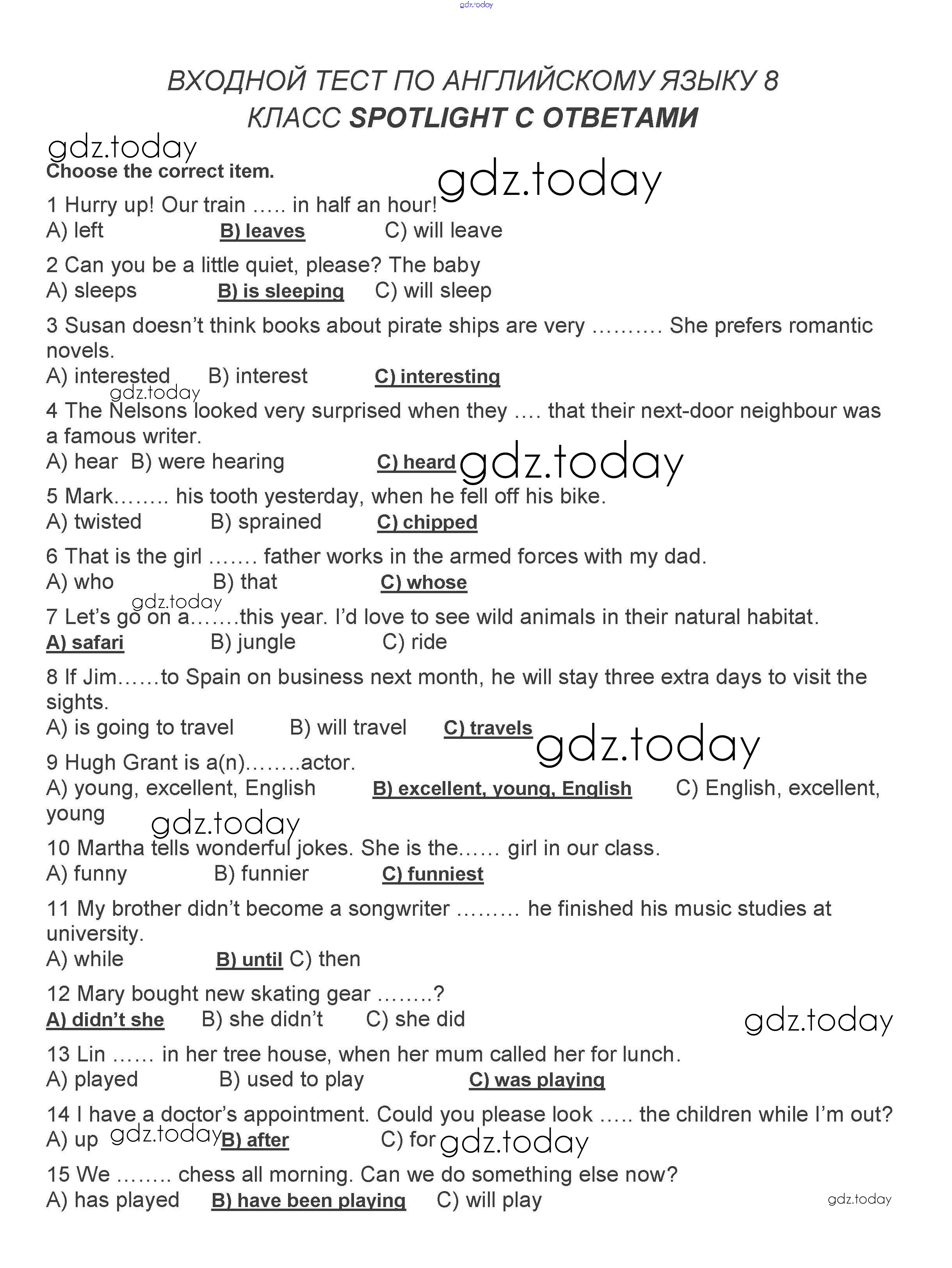 На страницах сайта gdz.today вы найдете учебный и вспомогательный материал, направленный на улучшения знаний школьной программы. ГДЗ - онлайн мир знаний Решение. Входной тест 1 Контрольным заданиям по Английскому языку для 8 класса Ваулина, Дули Просвещение Spotlight 2018
