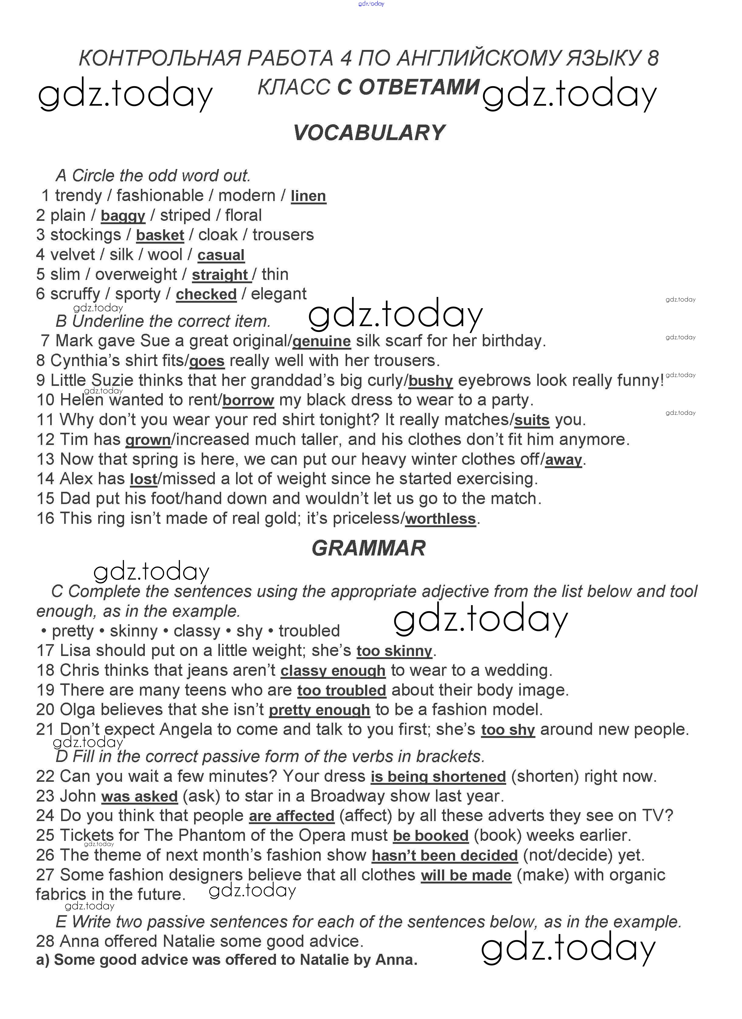 На страницах сайта gdz.today вы найдете учебный и вспомогательный материал, направленный на улучшения знаний школьной программы. ГДЗ - онлайн мир знаний Решение. Контрольная работа 4 A, B Контрольным заданиям по Английскому языку для 8 класса Ваулина, Дули Просвещение Spotlight 2018