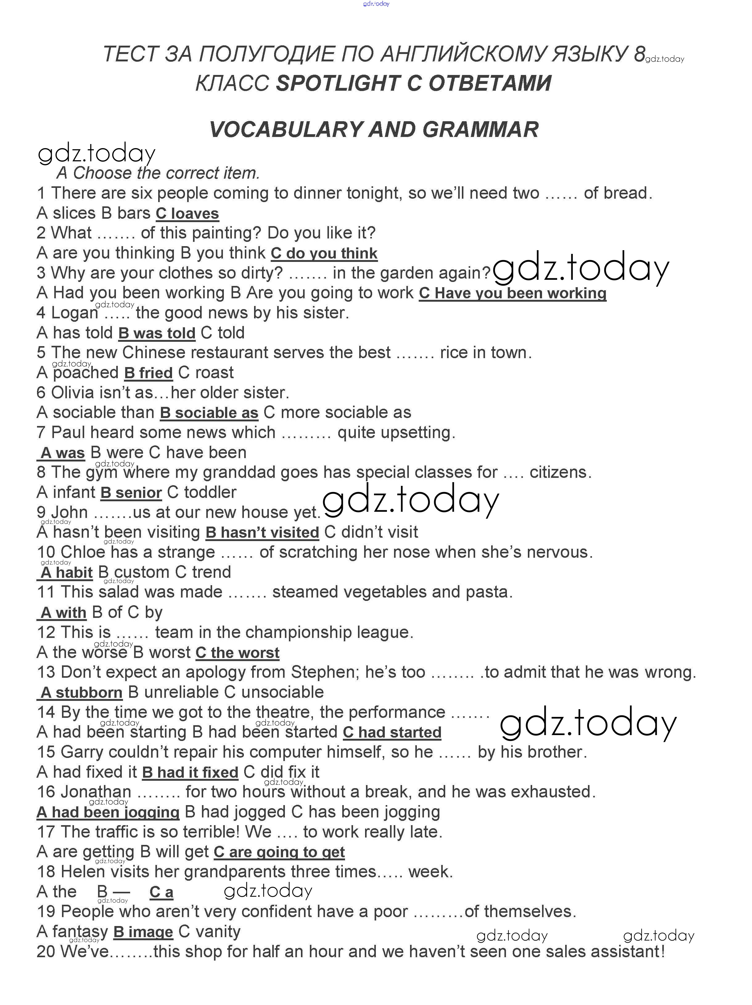 Ответы к Решение. Тест за полугодие A Контрольным заданиям по Английскому языку для 8 класса Ваулина, Дули Просвещение Spotlight 2018