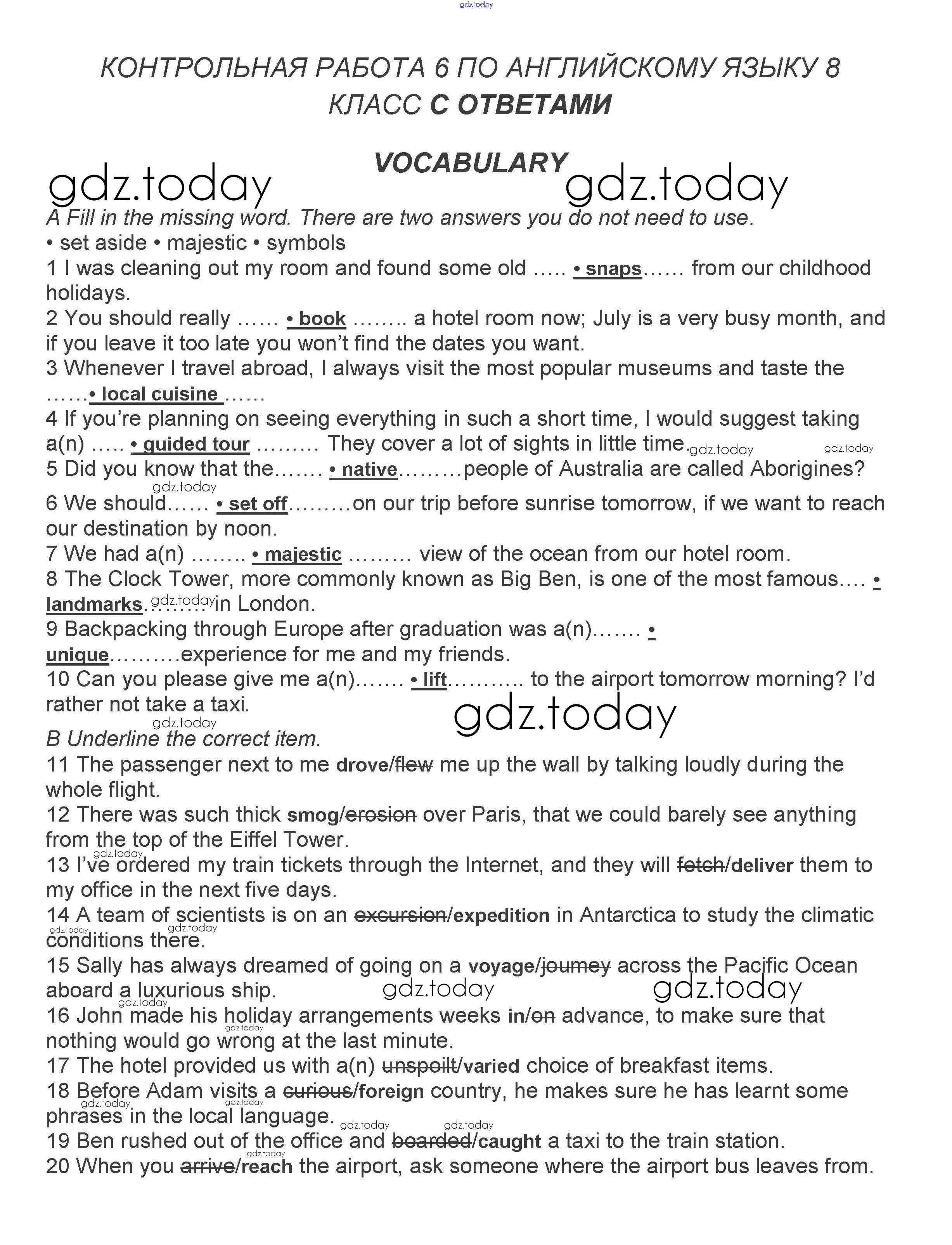 На страницах сайта gdz.today вы найдете учебный и вспомогательный материал, направленный на улучшения знаний школьной программы. ГДЗ - онлайн мир знаний Решение. Контрольная работа 6 A, B Контрольным заданиям по Английскому языку для 8 класса Ваулина, Дули Просвещение Spotlight 2018