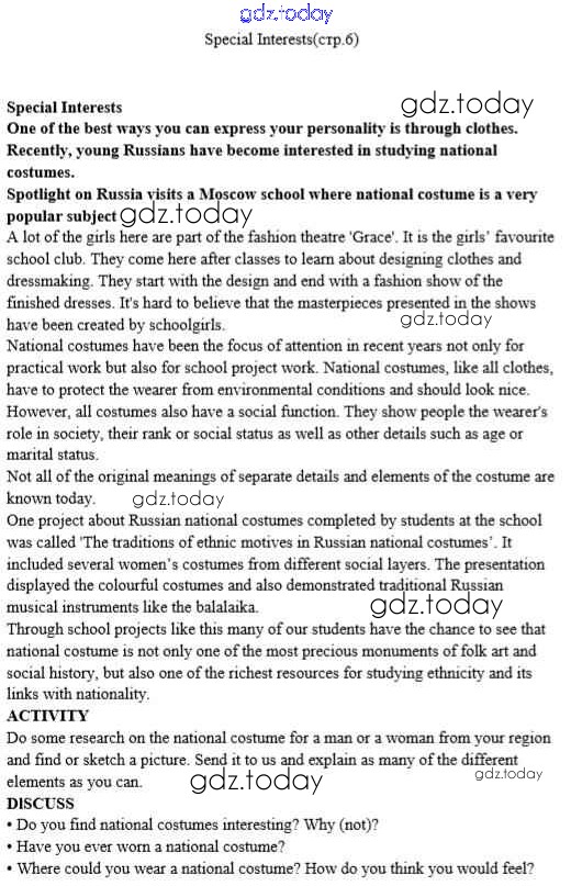 На страницах сайта gdz.today вы найдете учебный и вспомогательный материал, направленный на улучшения знаний школьной программы. ГДЗ - онлайн мир знаний Решение к Spotlight on Russia (страницы) 6 Учебнику по Английскому языку для 8 класса Ваулина, Дули Просвещение Spotlight 2015