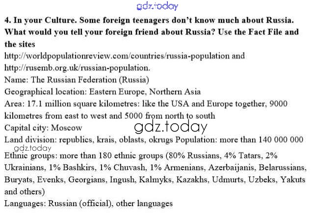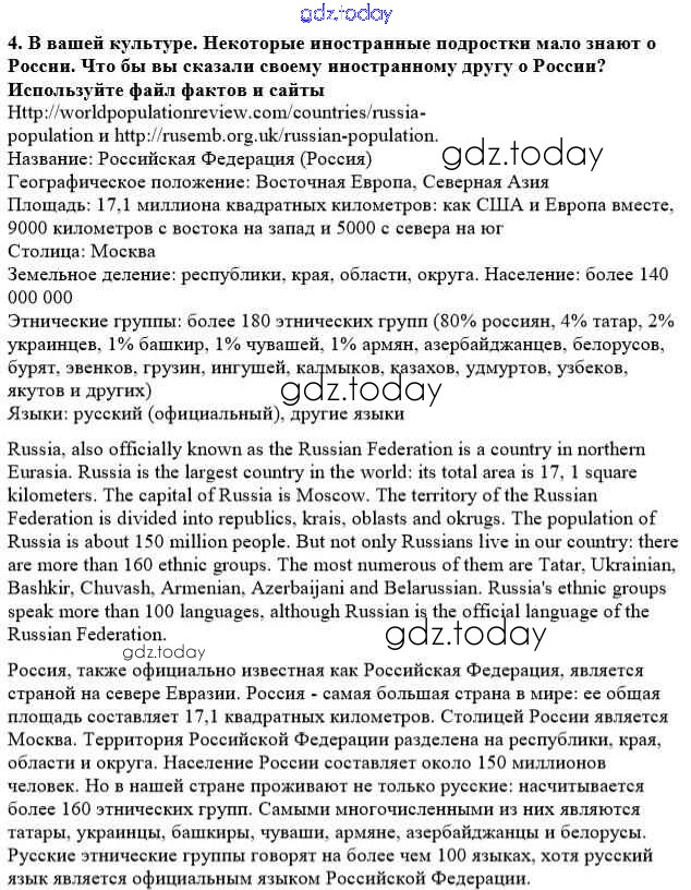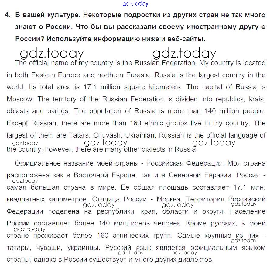 На страницах сайта gdz.today вы найдете учебный и вспомогательный материал, направленный на улучшения знаний школьной программы. ГДЗ - онлайн мир знаний lesson 1 Решение к Unit 1. My country at a glance 4 Учебнику по Английскому языку для 8 класса Кузовлев, Лапа Просвещение 2015